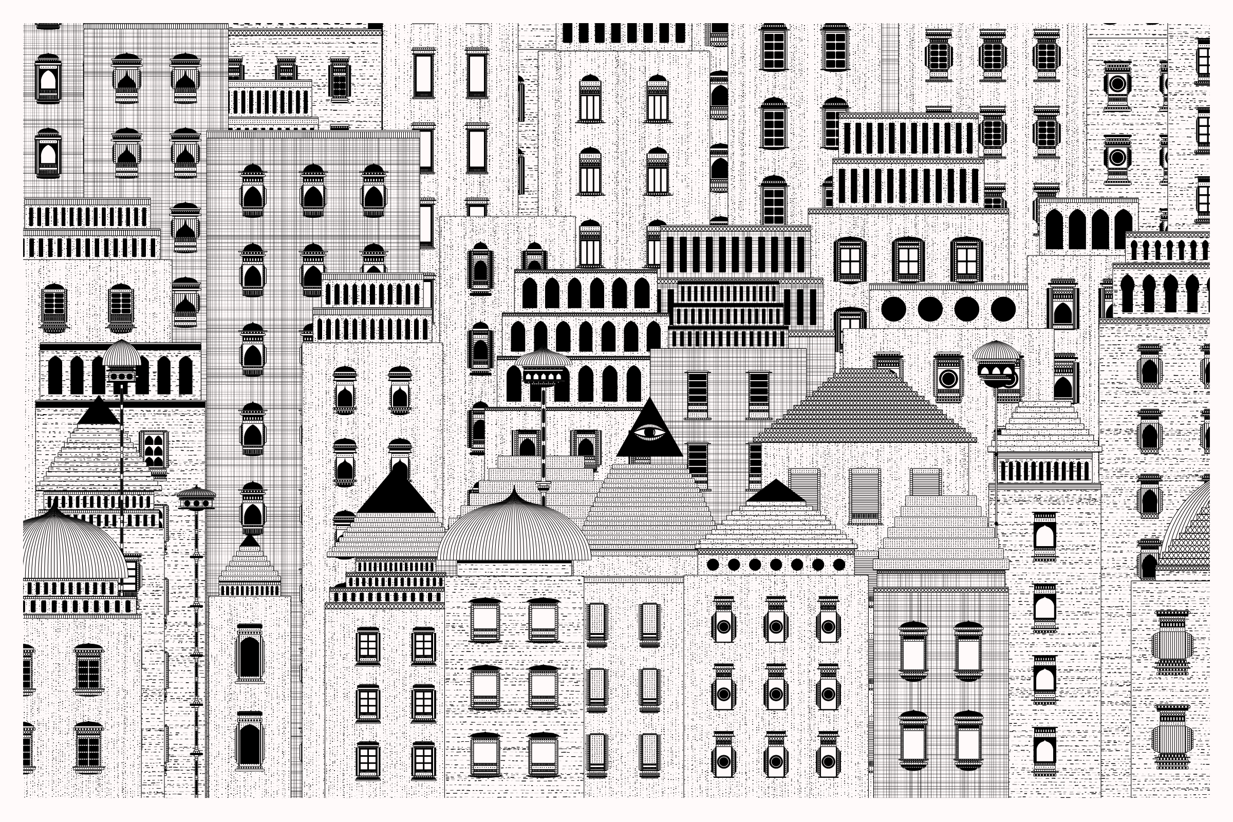 _Alan Ki Aankhen_ is an exploration of other-worldly cityscapes in the visual aesthetic of Fahad’s distinct style with pen and paper. The title, translated as _Alan’s Eyes_, alludes to Alan Turing’s machine intelligence test - a thought experiment foreshadowing a moment in which we can no longer differentiate between the real and the artificial. Though first proposed in 1950, the topic feels especially relevant today, as even our creative practices are being carried by shifting technological tides.