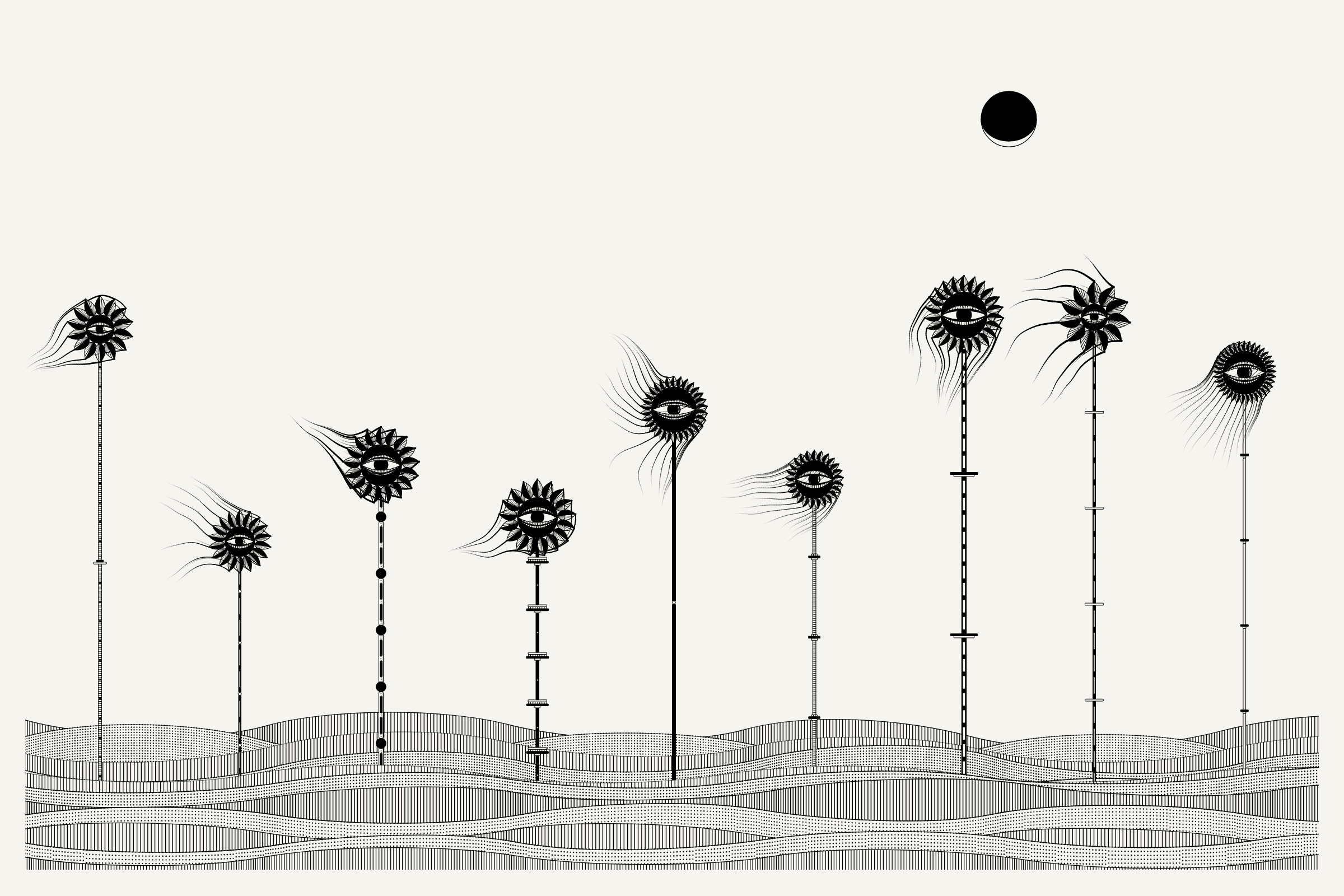 _Alan Ki Aankhen_ is an exploration of other-worldly cityscapes in the visual aesthetic of Fahad’s distinct style with pen and paper. The title, translated as _Alan’s Eyes_, alludes to Alan Turing’s machine intelligence test - a thought experiment foreshadowing a moment in which we can no longer differentiate between the real and the artificial. Though first proposed in 1950, the topic feels especially relevant today, as even our creative practices are being carried by shifting technological tides.