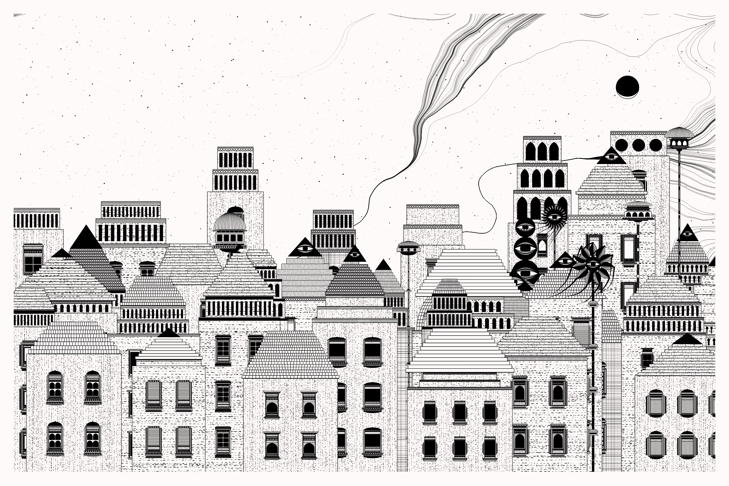 _Alan Ki Aankhen_ is an exploration of other-worldly cityscapes in the visual aesthetic of Fahad’s distinct style with pen and paper. The title, translated as _Alan’s Eyes_, alludes to Alan Turing’s machine intelligence test - a thought experiment foreshadowing a moment in which we can no longer differentiate between the real and the artificial. Though first proposed in 1950, the topic feels especially relevant today, as even our creative practices are being carried by shifting technological tides.