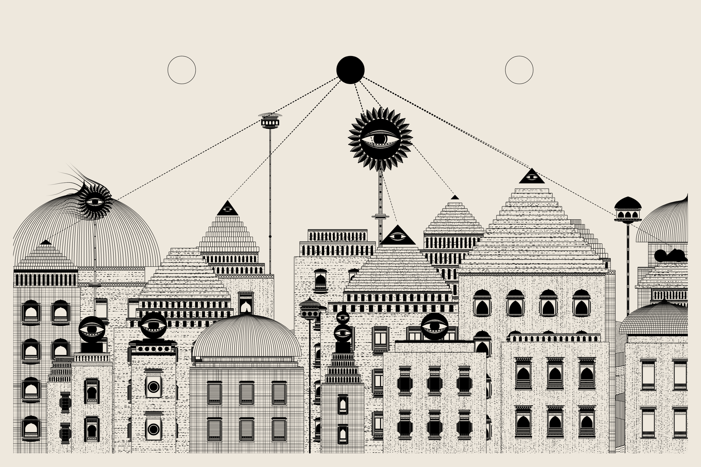 _Alan Ki Aankhen_ is an exploration of other-worldly cityscapes in the visual aesthetic of Fahad’s distinct style with pen and paper. The title, translated as _Alan’s Eyes_, alludes to Alan Turing’s machine intelligence test - a thought experiment foreshadowing a moment in which we can no longer differentiate between the real and the artificial. Though first proposed in 1950, the topic feels especially relevant today, as even our creative practices are being carried by shifting technological tides.