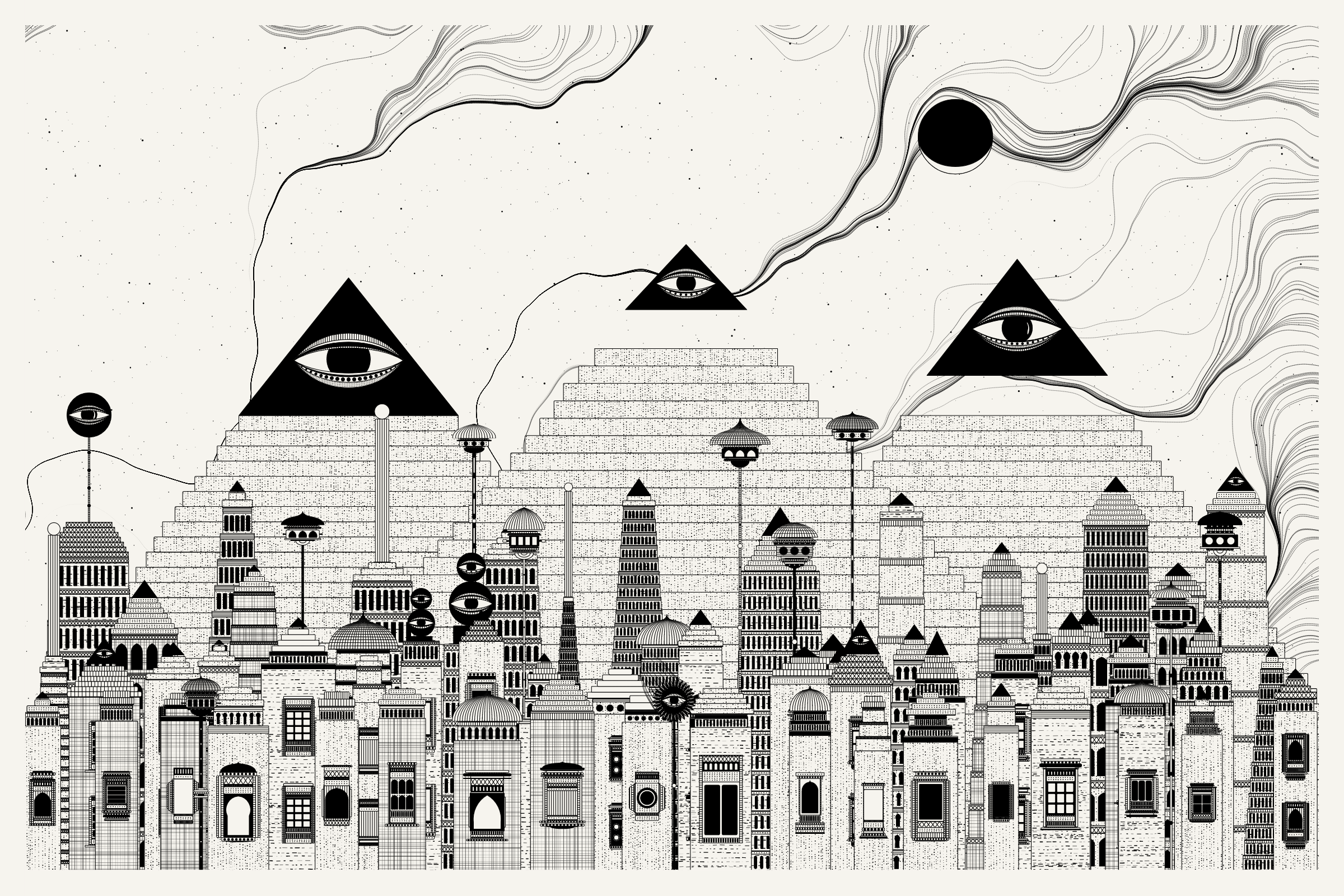 _Alan Ki Aankhen_ is an exploration of other-worldly cityscapes in the visual aesthetic of Fahad’s distinct style with pen and paper. The title, translated as _Alan’s Eyes_, alludes to Alan Turing’s machine intelligence test - a thought experiment foreshadowing a moment in which we can no longer differentiate between the real and the artificial. Though first proposed in 1950, the topic feels especially relevant today, as even our creative practices are being carried by shifting technological tides.
