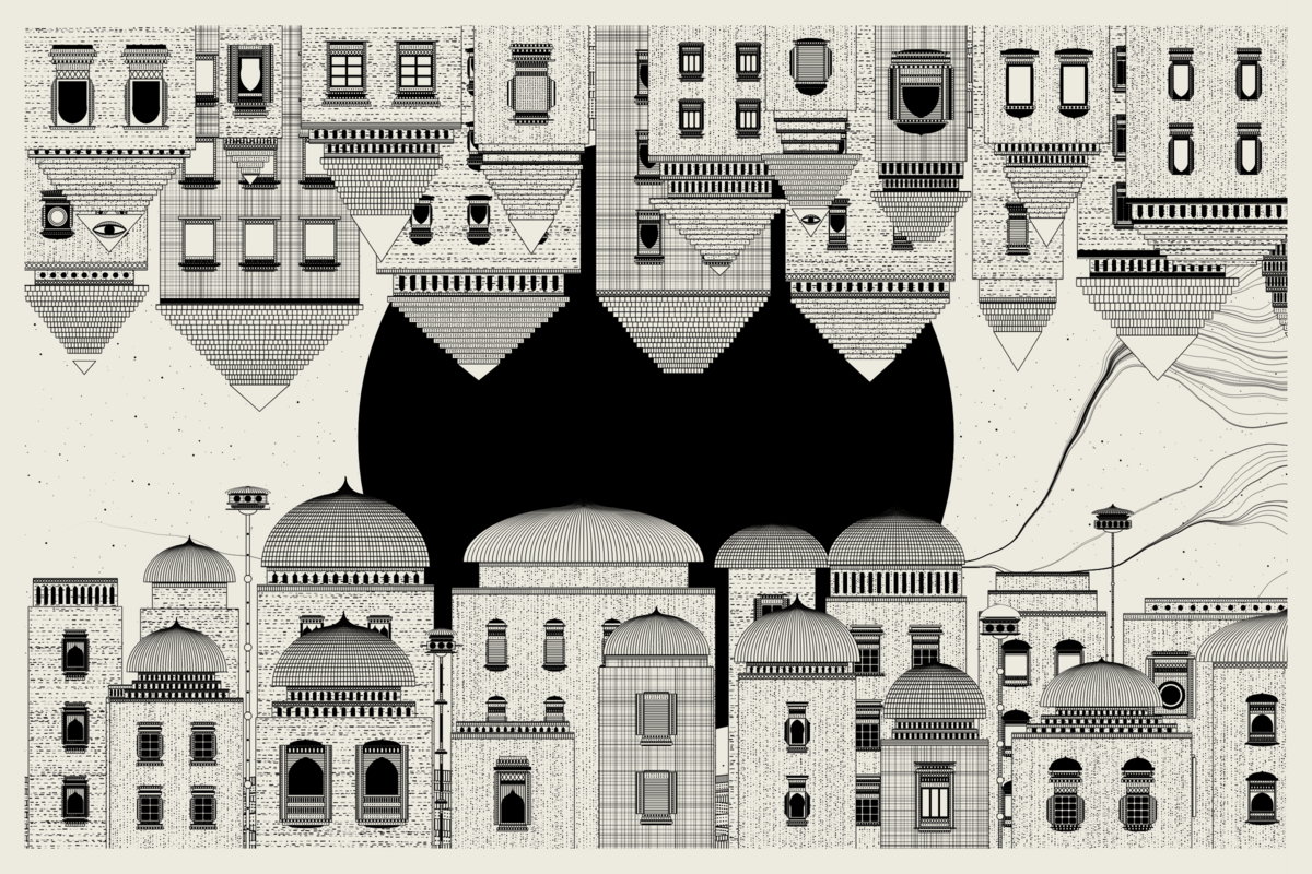 _Alan Ki Aankhen_ is an exploration of other-worldly cityscapes in the visual aesthetic of Fahad’s distinct style with pen and paper. The title, translated as _Alan’s Eyes_, alludes to Alan Turing’s machine intelligence test - a thought experiment foreshadowing a moment in which we can no longer differentiate between the real and the artificial. Though first proposed in 1950, the topic feels especially relevant today, as even our creative practices are being carried by shifting technological tides.