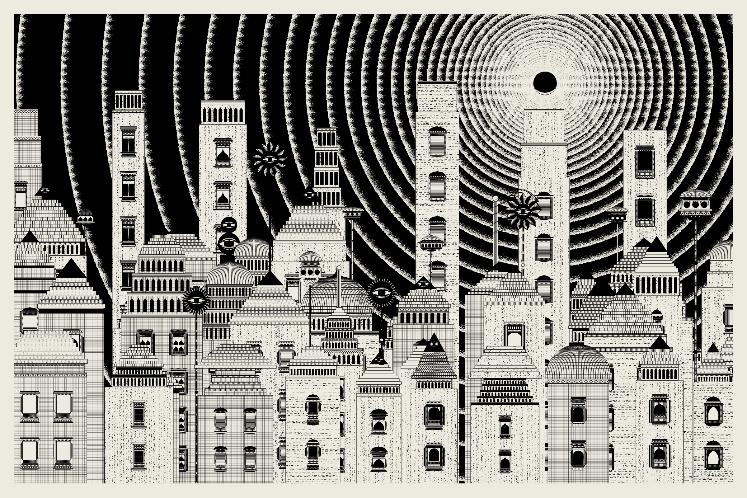 _Alan Ki Aankhen_ is an exploration of other-worldly cityscapes in the visual aesthetic of Fahad’s distinct style with pen and paper. The title, translated as _Alan’s Eyes_, alludes to Alan Turing’s machine intelligence test - a thought experiment foreshadowing a moment in which we can no longer differentiate between the real and the artificial. Though first proposed in 1950, the topic feels especially relevant today, as even our creative practices are being carried by shifting technological tides.