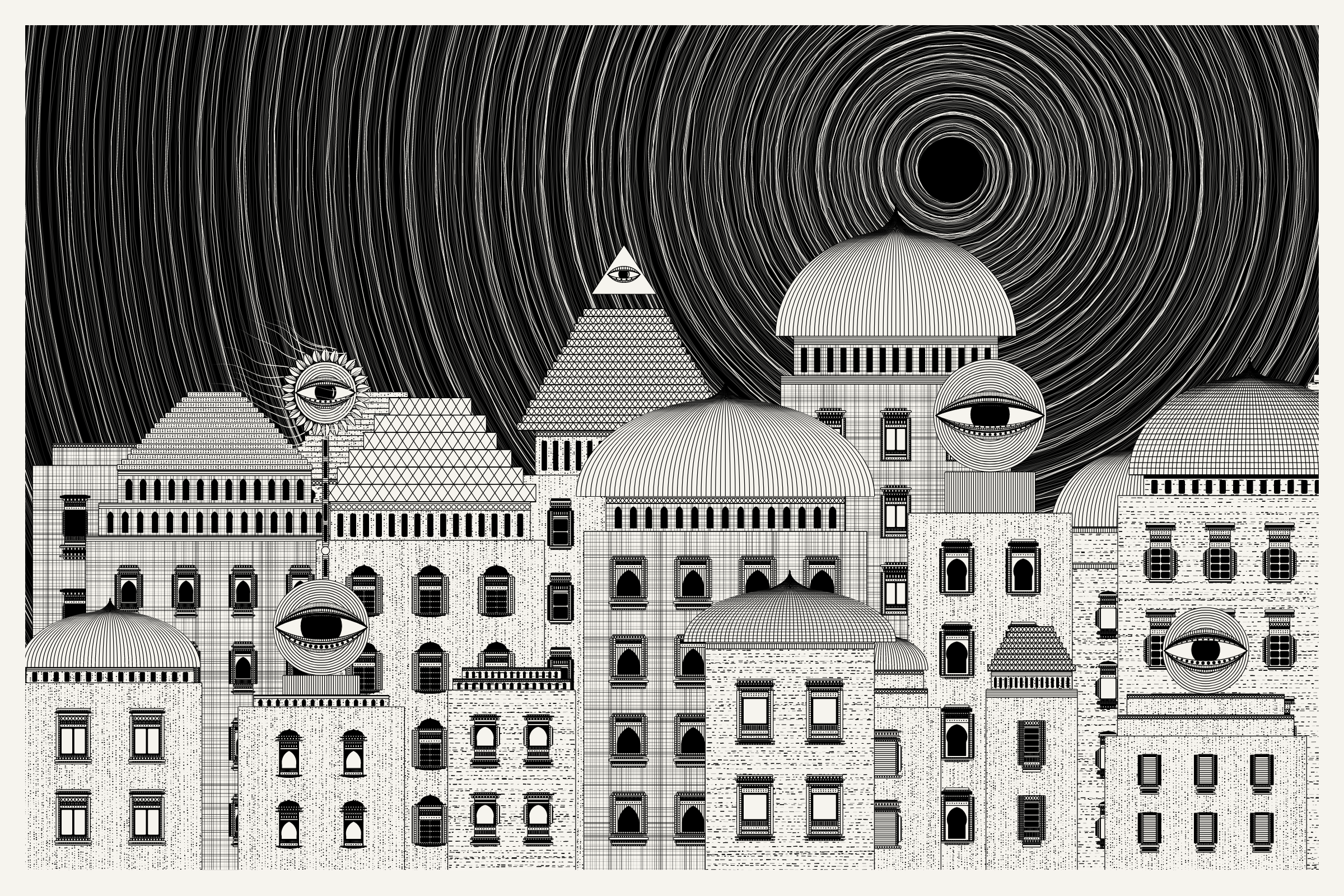 _Alan Ki Aankhen_ is an exploration of other-worldly cityscapes in the visual aesthetic of Fahad’s distinct style with pen and paper. The title, translated as _Alan’s Eyes_, alludes to Alan Turing’s machine intelligence test - a thought experiment foreshadowing a moment in which we can no longer differentiate between the real and the artificial. Though first proposed in 1950, the topic feels especially relevant today, as even our creative practices are being carried by shifting technological tides.