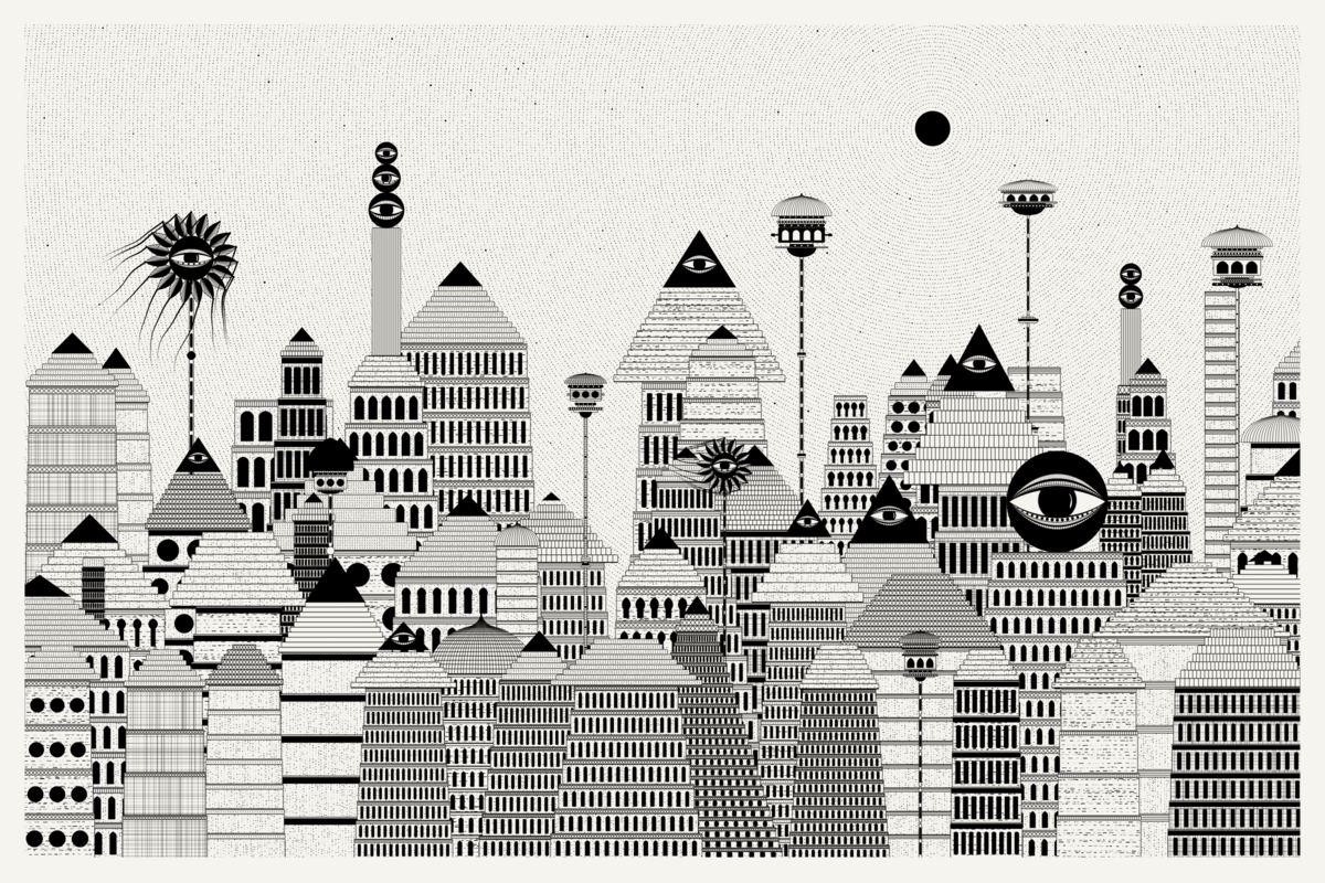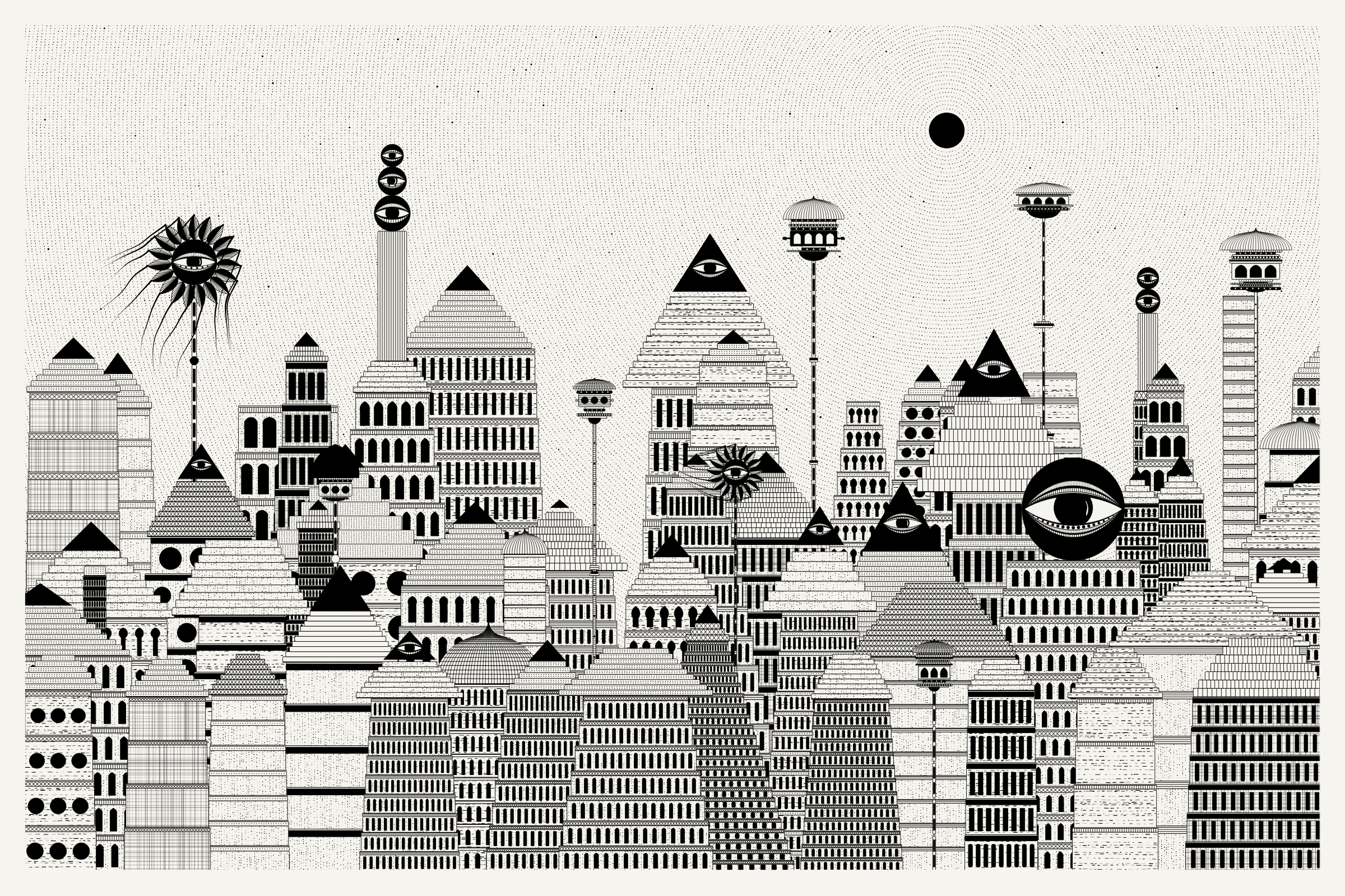 _Alan Ki Aankhen_ is an exploration of other-worldly cityscapes in the visual aesthetic of Fahad’s distinct style with pen and paper. The title, translated as _Alan’s Eyes_, alludes to Alan Turing’s machine intelligence test - a thought experiment foreshadowing a moment in which we can no longer differentiate between the real and the artificial. Though first proposed in 1950, the topic feels especially relevant today, as even our creative practices are being carried by shifting technological tides.