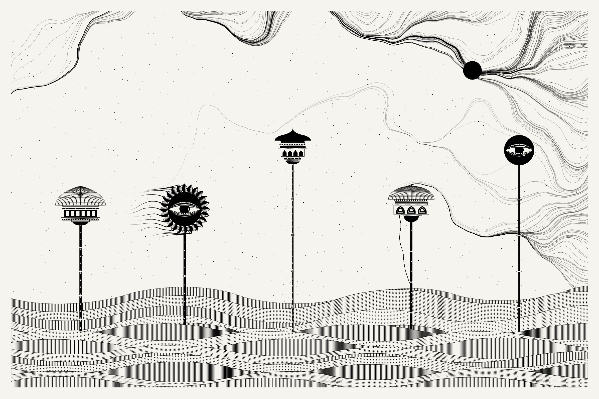 _Alan Ki Aankhen_ is an exploration of other-worldly cityscapes in the visual aesthetic of Fahad’s distinct style with pen and paper. The title, translated as _Alan’s Eyes_, alludes to Alan Turing’s machine intelligence test - a thought experiment foreshadowing a moment in which we can no longer differentiate between the real and the artificial. Though first proposed in 1950, the topic feels especially relevant today, as even our creative practices are being carried by shifting technological tides.