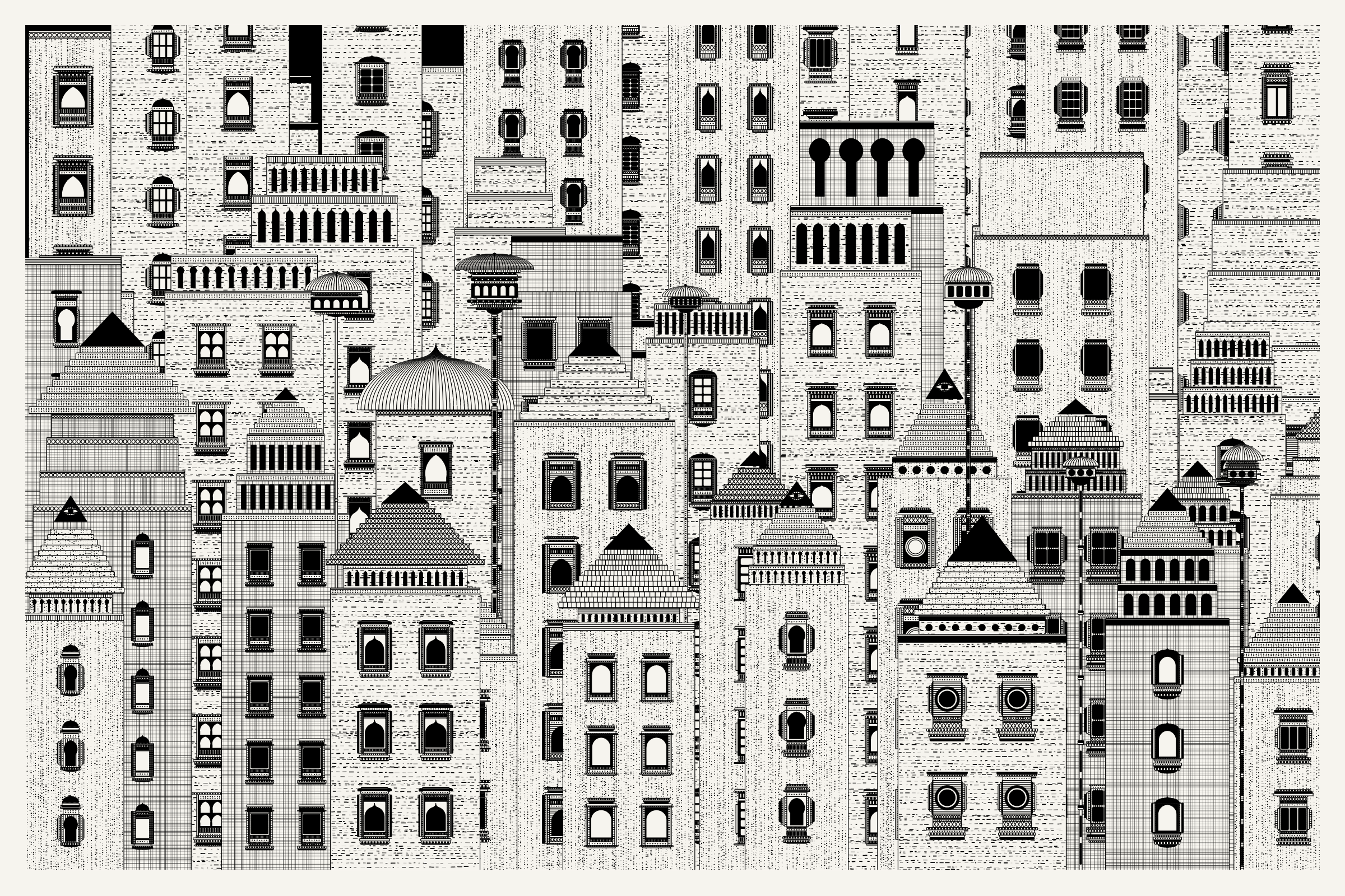 The algorithms and decision-making encoded into this generative art project intentionally imitate Fahad’s approach on traditional mediums - composition rules, textures, and overall themes. The visual elements are inspired by Fahad’s memories from his nomadic life. You’ll find intricate windows from Rajasthan, massive Egyptian pyramids rising from the horizon, a density of civilization only seen in New York, and the moon - a comforting and shared sight no matter where you stand.