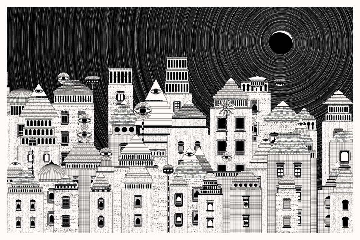 _Alan Ki Aankhen_ is an exploration of other-worldly cityscapes in the visual aesthetic of Fahad’s distinct style with pen and paper. The title, translated as _Alan’s Eyes_, alludes to Alan Turing’s machine intelligence test - a thought experiment foreshadowing a moment in which we can no longer differentiate between the real and the artificial. Though first proposed in 1950, the topic feels especially relevant today, as even our creative practices are being carried by shifting technological tides.