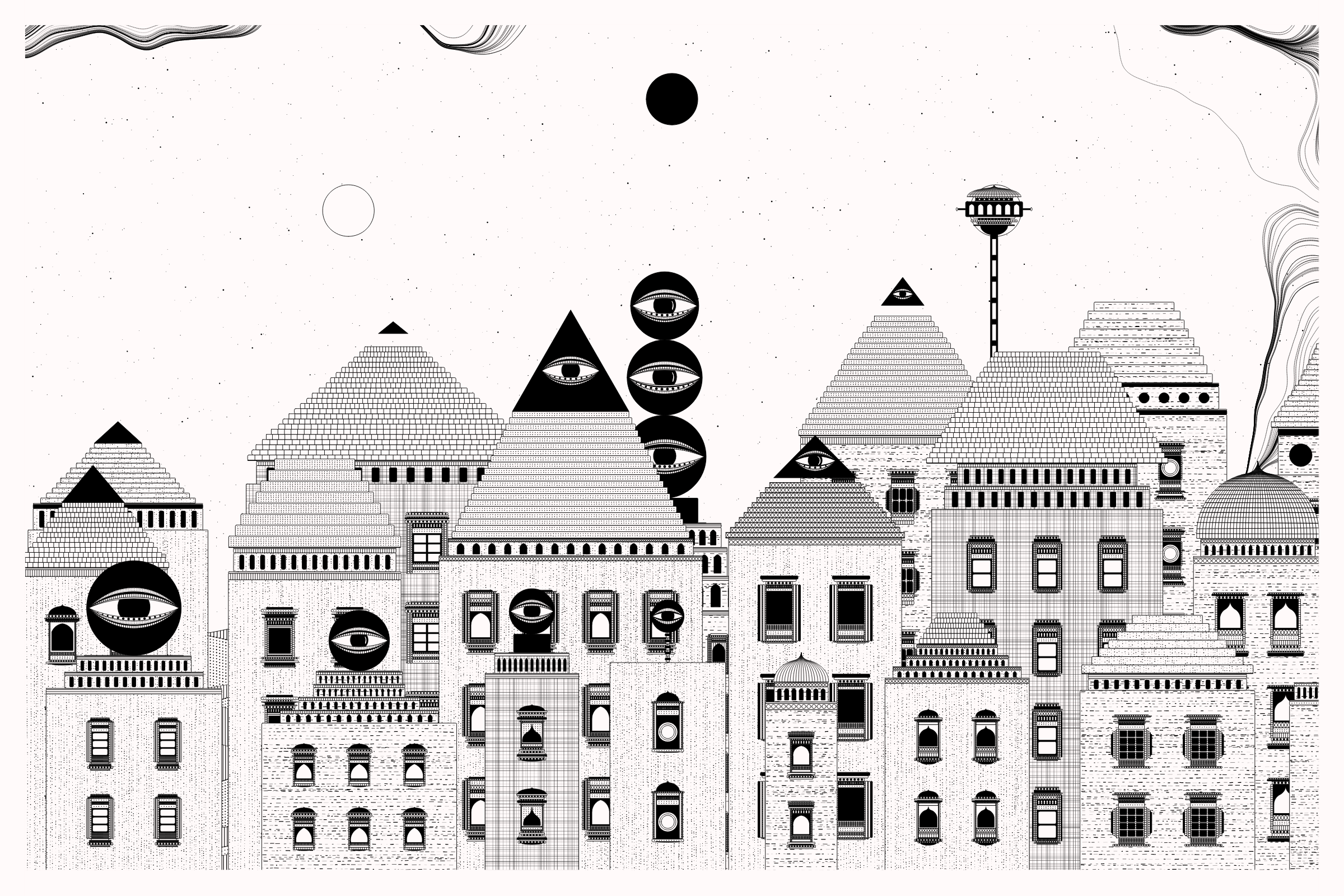 _Alan Ki Aankhen_ is an exploration of other-worldly cityscapes in the visual aesthetic of Fahad’s distinct style with pen and paper. The title, translated as _Alan’s Eyes_, alludes to Alan Turing’s machine intelligence test - a thought experiment foreshadowing a moment in which we can no longer differentiate between the real and the artificial. Though first proposed in 1950, the topic feels especially relevant today, as even our creative practices are being carried by shifting technological tides.