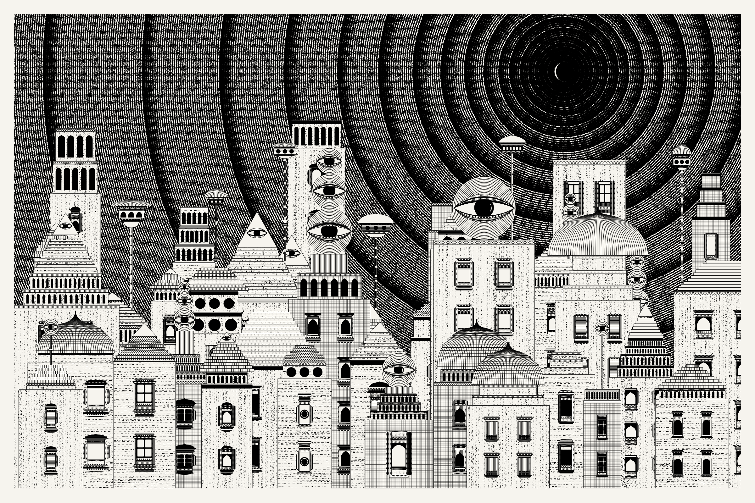 _Alan Ki Aankhen_ is an exploration of other-worldly cityscapes in the visual aesthetic of Fahad’s distinct style with pen and paper. The title, translated as _Alan’s Eyes_, alludes to Alan Turing’s machine intelligence test - a thought experiment foreshadowing a moment in which we can no longer differentiate between the real and the artificial. Though first proposed in 1950, the topic feels especially relevant today, as even our creative practices are being carried by shifting technological tides.
