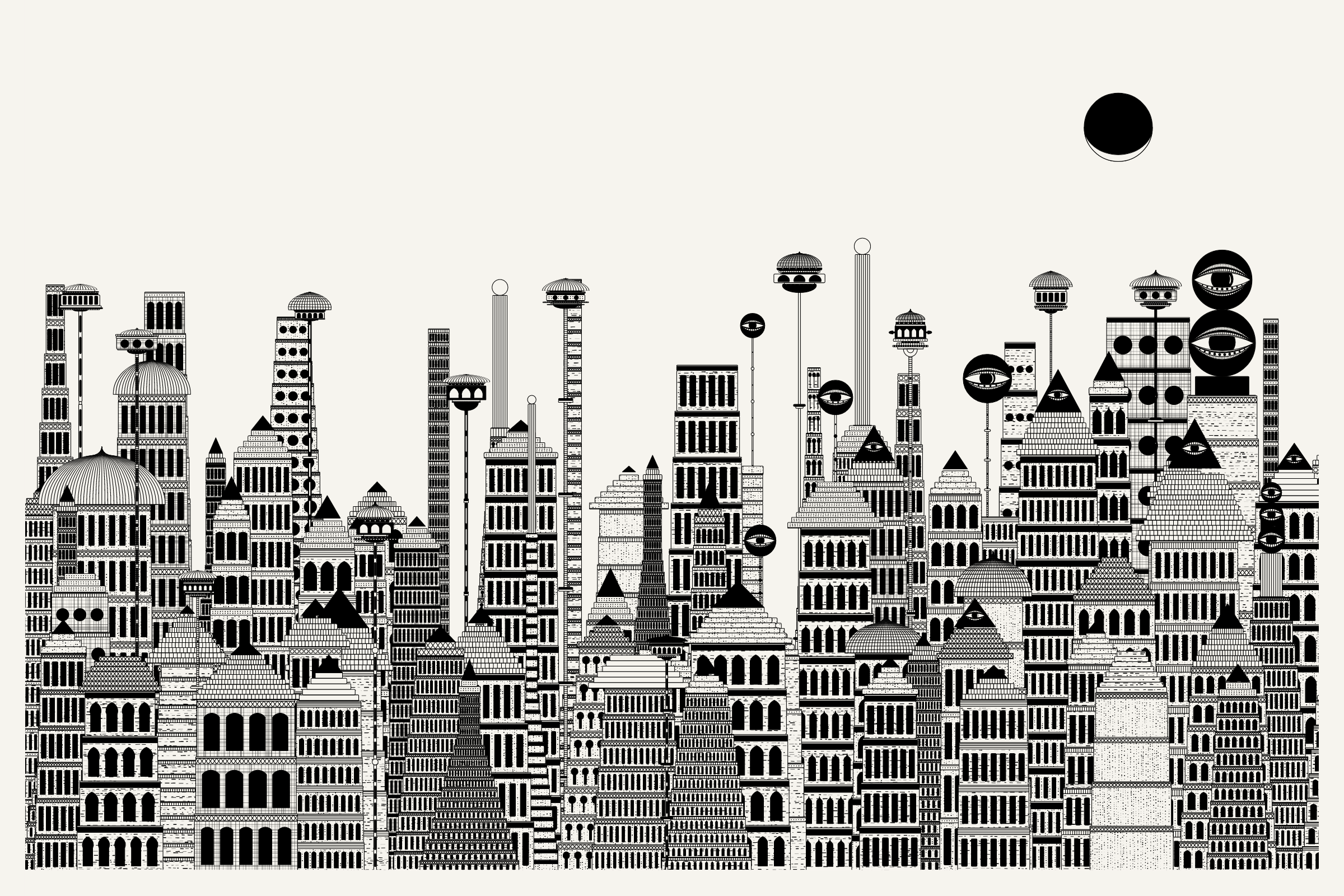 _Alan Ki Aankhen_ is an exploration of other-worldly cityscapes in the visual aesthetic of Fahad’s distinct style with pen and paper. The title, translated as _Alan’s Eyes_, alludes to Alan Turing’s machine intelligence test - a thought experiment foreshadowing a moment in which we can no longer differentiate between the real and the artificial. Though first proposed in 1950, the topic feels especially relevant today, as even our creative practices are being carried by shifting technological tides.