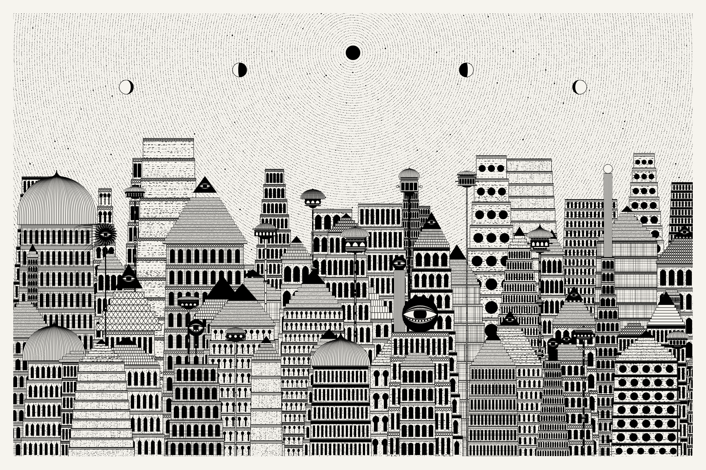 The algorithms and decision-making encoded into this generative art project intentionally imitate Fahad’s approach on traditional mediums - composition rules, textures, and overall themes. The visual elements are inspired by Fahad’s memories from his nomadic life. You’ll find intricate windows from Rajasthan, massive Egyptian pyramids rising from the horizon, a density of civilization only seen in New York, and the moon - a comforting and shared sight no matter where you stand.