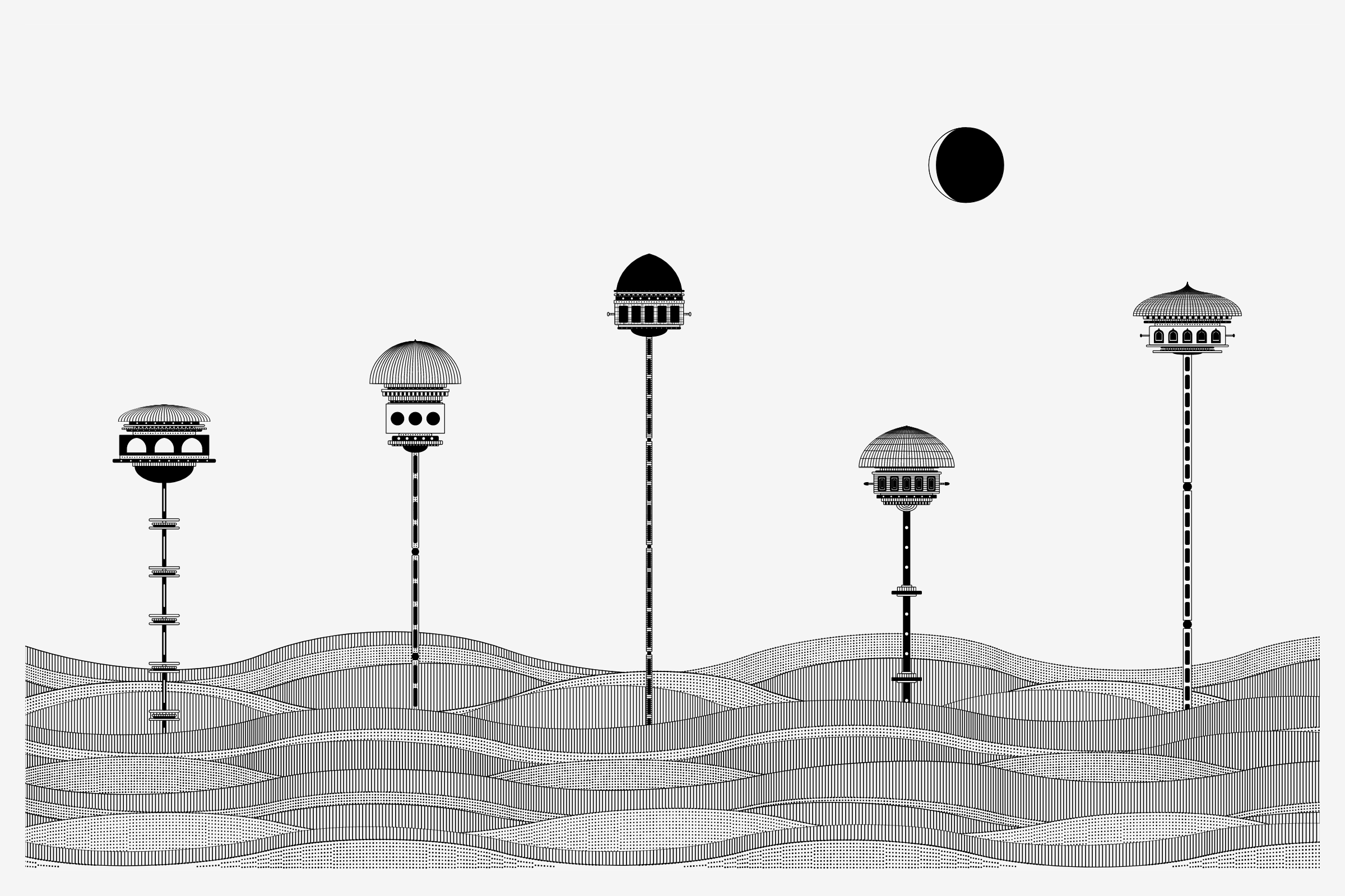 _Alan Ki Aankhen_ is an exploration of other-worldly cityscapes in the visual aesthetic of Fahad’s distinct style with pen and paper. The title, translated as _Alan’s Eyes_, alludes to Alan Turing’s machine intelligence test - a thought experiment foreshadowing a moment in which we can no longer differentiate between the real and the artificial. Though first proposed in 1950, the topic feels especially relevant today, as even our creative practices are being carried by shifting technological tides.