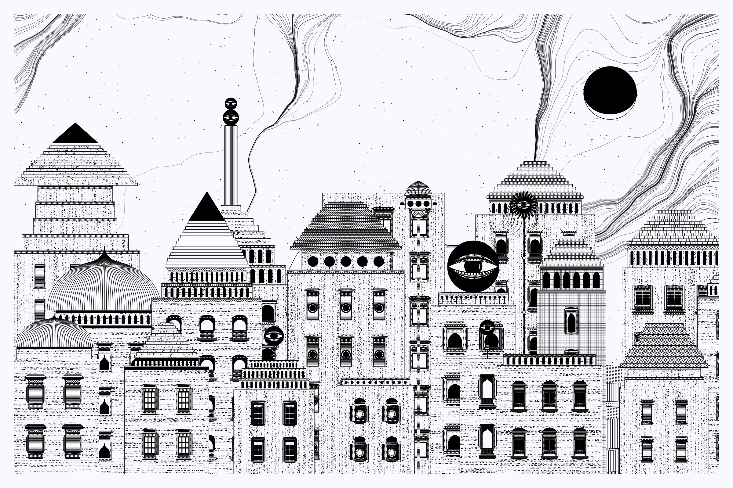 _Alan Ki Aankhen_ is an exploration of other-worldly cityscapes in the visual aesthetic of Fahad’s distinct style with pen and paper. The title, translated as _Alan’s Eyes_, alludes to Alan Turing’s machine intelligence test - a thought experiment foreshadowing a moment in which we can no longer differentiate between the real and the artificial. Though first proposed in 1950, the topic feels especially relevant today, as even our creative practices are being carried by shifting technological tides.