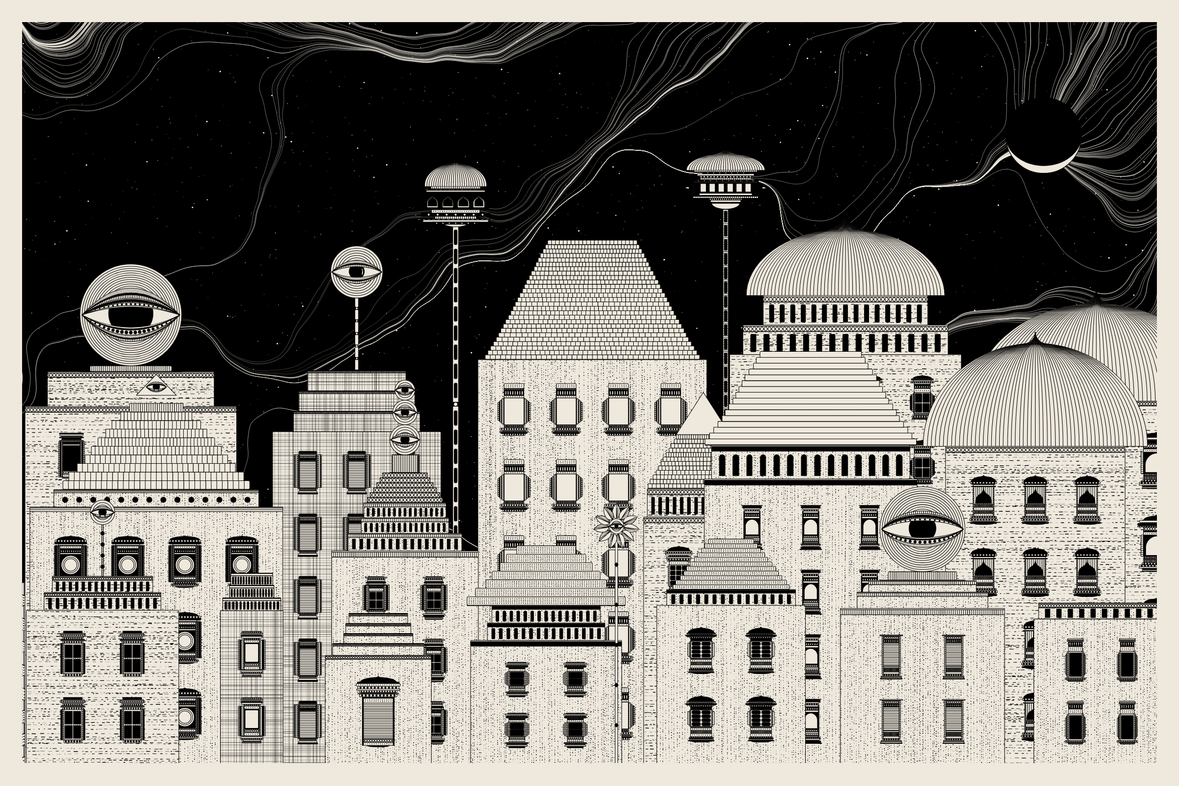 _Alan Ki Aankhen_ is an exploration of other-worldly cityscapes in the visual aesthetic of Fahad’s distinct style with pen and paper. The title, translated as _Alan’s Eyes_, alludes to Alan Turing’s machine intelligence test - a thought experiment foreshadowing a moment in which we can no longer differentiate between the real and the artificial. Though first proposed in 1950, the topic feels especially relevant today, as even our creative practices are being carried by shifting technological tides.