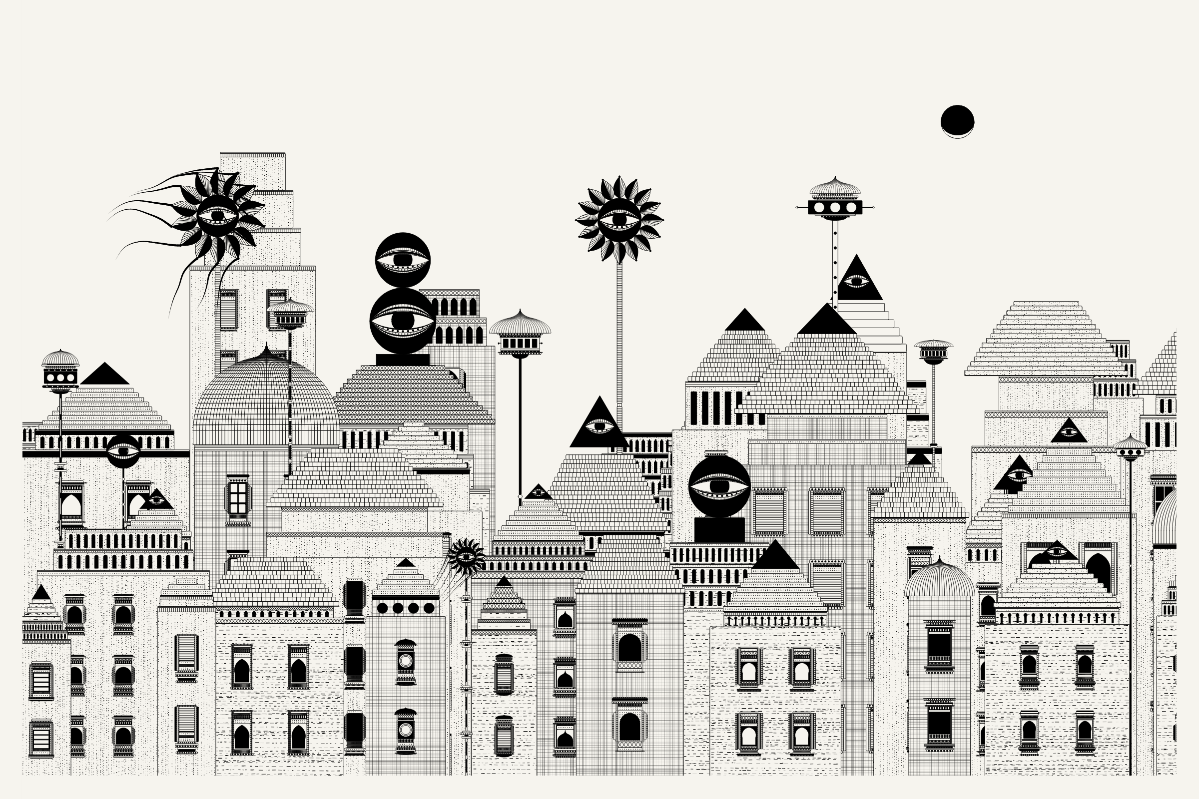 The algorithms and decision-making encoded into this generative art project intentionally imitate Fahad’s approach on traditional mediums - composition rules, textures, and overall themes. The visual elements are inspired by Fahad’s memories from his nomadic life. You’ll find intricate windows from Rajasthan, massive Egyptian pyramids rising from the horizon, a density of civilization only seen in New York, and the moon - a comforting and shared sight no matter where you stand.