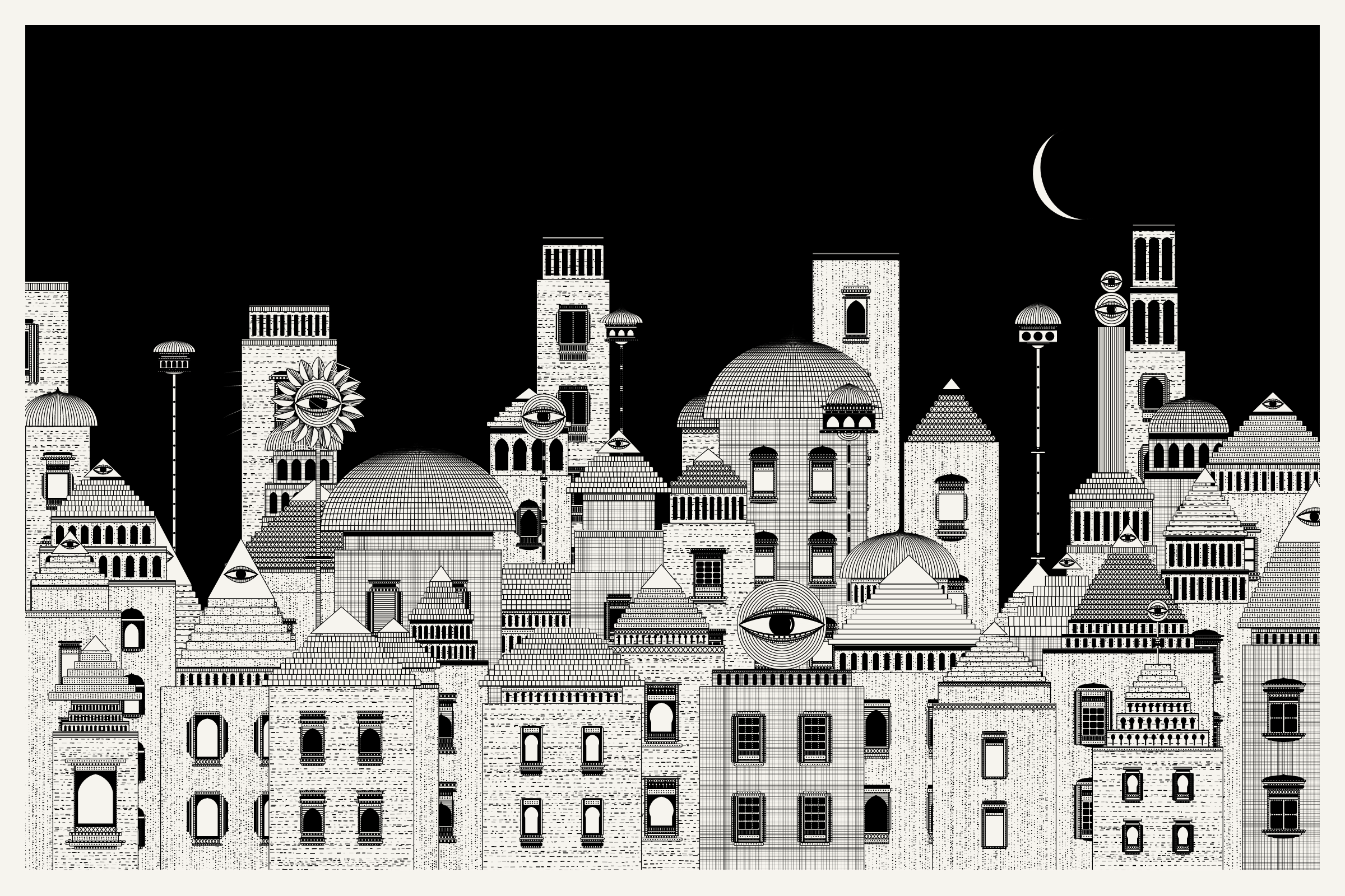 The algorithms and decision-making encoded into this generative art project intentionally imitate Fahad’s approach on traditional mediums - composition rules, textures, and overall themes. The visual elements are inspired by Fahad’s memories from his nomadic life. You’ll find intricate windows from Rajasthan, massive Egyptian pyramids rising from the horizon, a density of civilization only seen in New York, and the moon - a comforting and shared sight no matter where you stand.