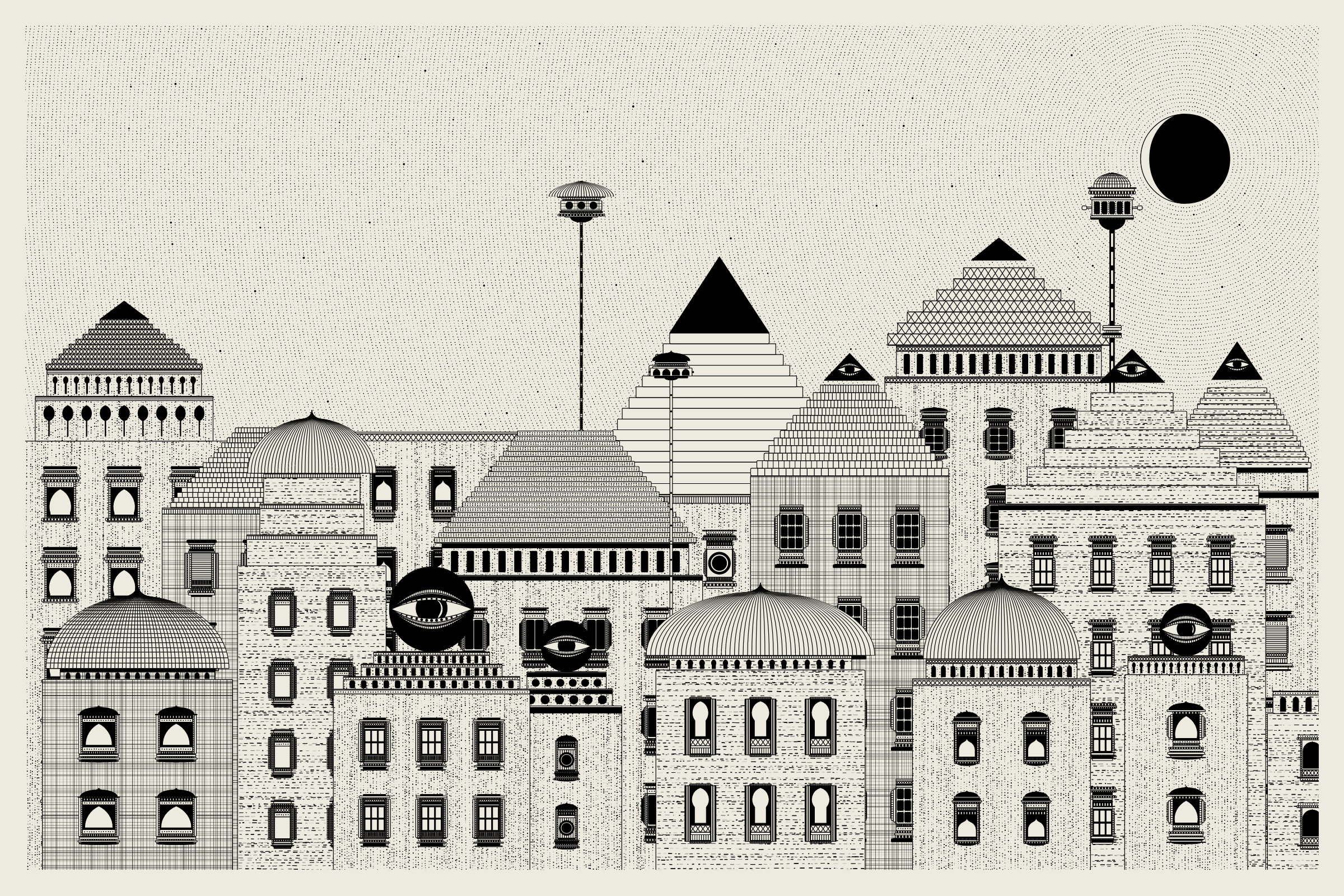 The algorithms and decision-making encoded into this generative art project intentionally imitate Fahad’s approach on traditional mediums - composition rules, textures, and overall themes. The visual elements are inspired by Fahad’s memories from his nomadic life. You’ll find intricate windows from Rajasthan, massive Egyptian pyramids rising from the horizon, a density of civilization only seen in New York, and the moon - a comforting and shared sight no matter where you stand.