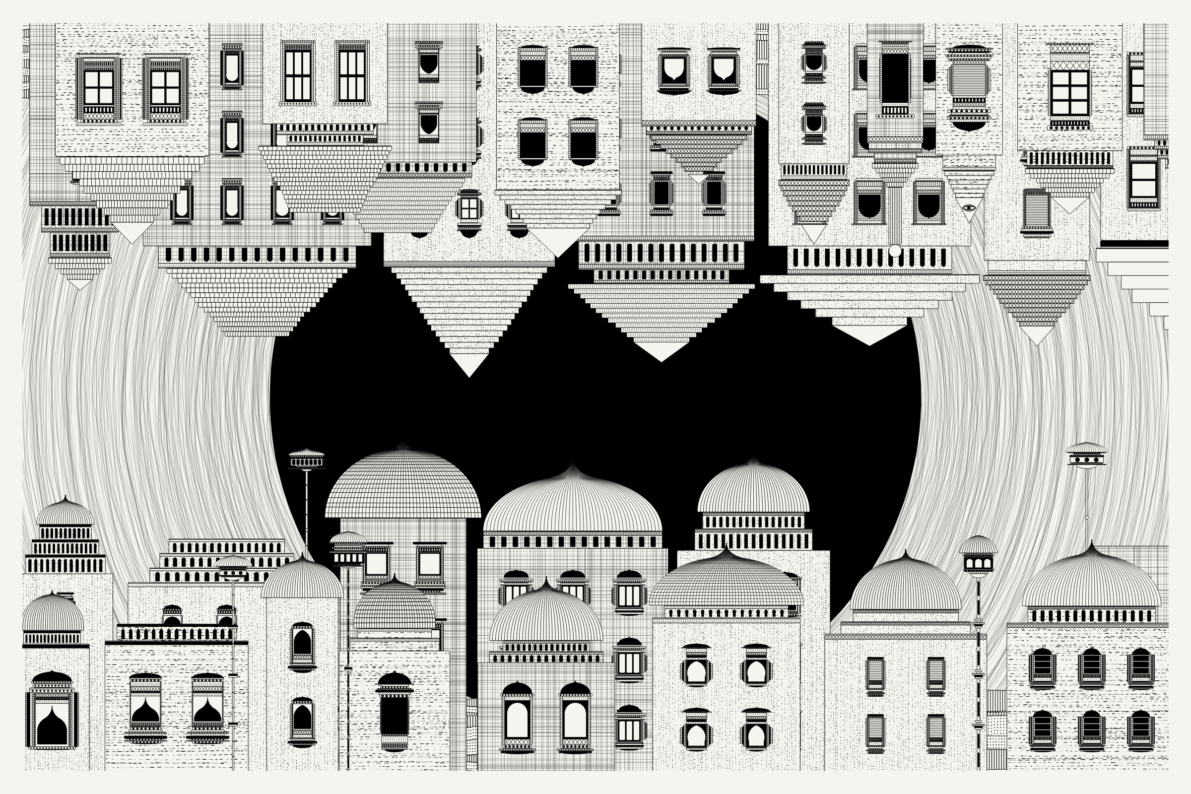 _Alan Ki Aankhen_ is an exploration of other-worldly cityscapes in the visual aesthetic of Fahad’s distinct style with pen and paper. The title, translated as _Alan’s Eyes_, alludes to Alan Turing’s machine intelligence test - a thought experiment foreshadowing a moment in which we can no longer differentiate between the real and the artificial. Though first proposed in 1950, the topic feels especially relevant today, as even our creative practices are being carried by shifting technological tides.