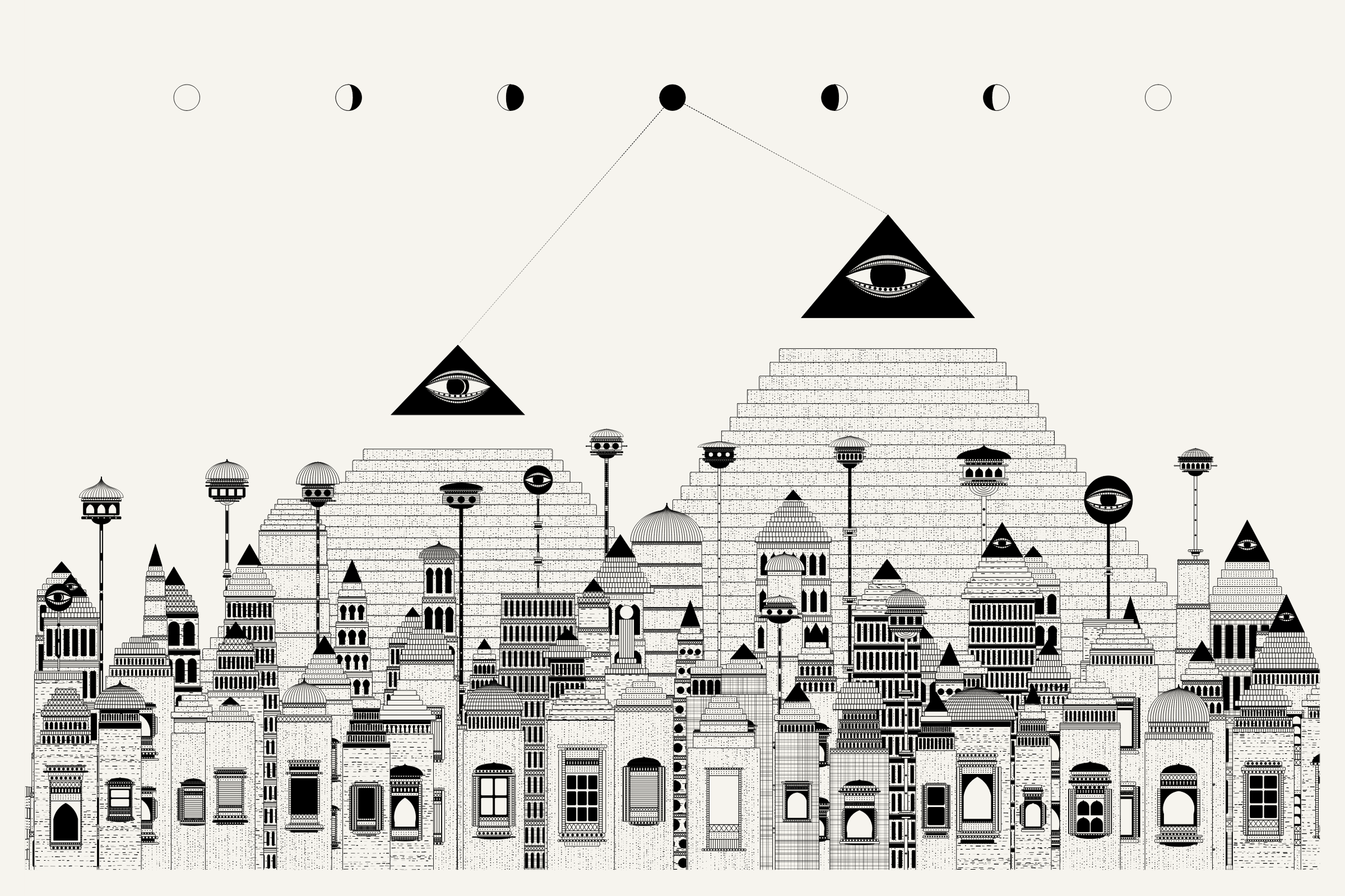 _Alan Ki Aankhen_ is an exploration of other-worldly cityscapes in the visual aesthetic of Fahad’s distinct style with pen and paper. The title, translated as _Alan’s Eyes_, alludes to Alan Turing’s machine intelligence test - a thought experiment foreshadowing a moment in which we can no longer differentiate between the real and the artificial. Though first proposed in 1950, the topic feels especially relevant today, as even our creative practices are being carried by shifting technological tides.