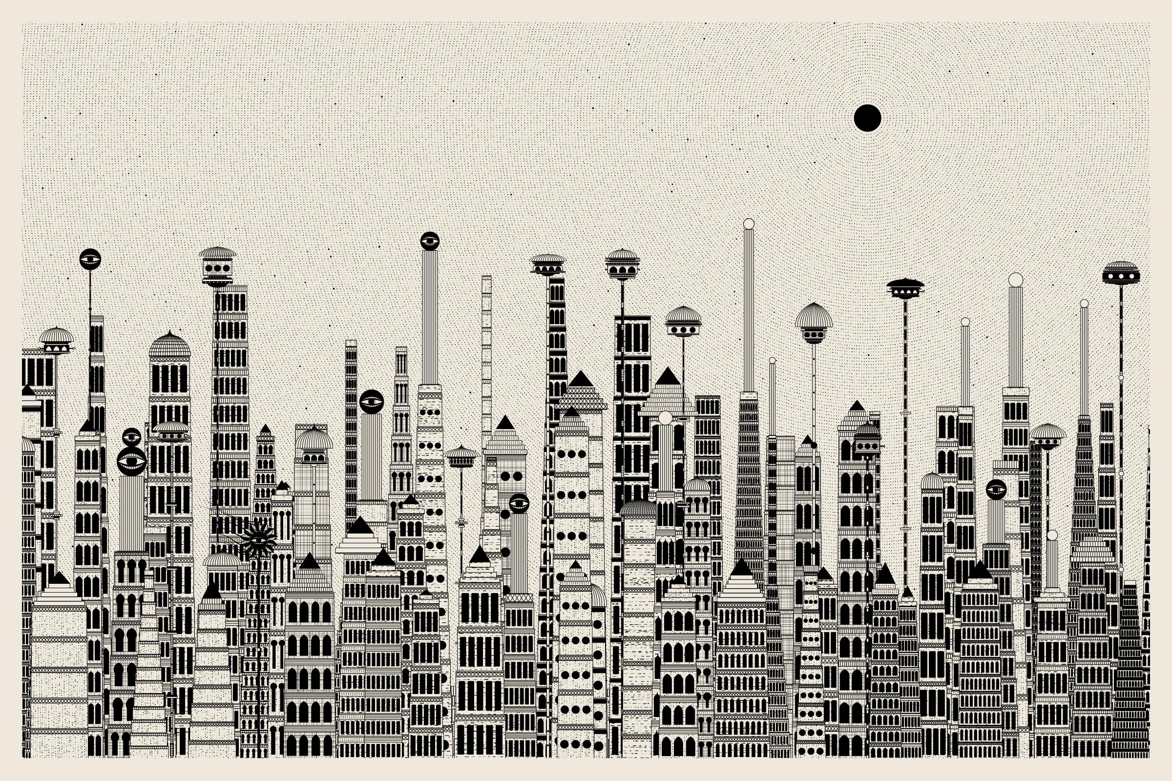 _Alan Ki Aankhen_ is an exploration of other-worldly cityscapes in the visual aesthetic of Fahad’s distinct style with pen and paper. The title, translated as _Alan’s Eyes_, alludes to Alan Turing’s machine intelligence test - a thought experiment foreshadowing a moment in which we can no longer differentiate between the real and the artificial. Though first proposed in 1950, the topic feels especially relevant today, as even our creative practices are being carried by shifting technological tides.