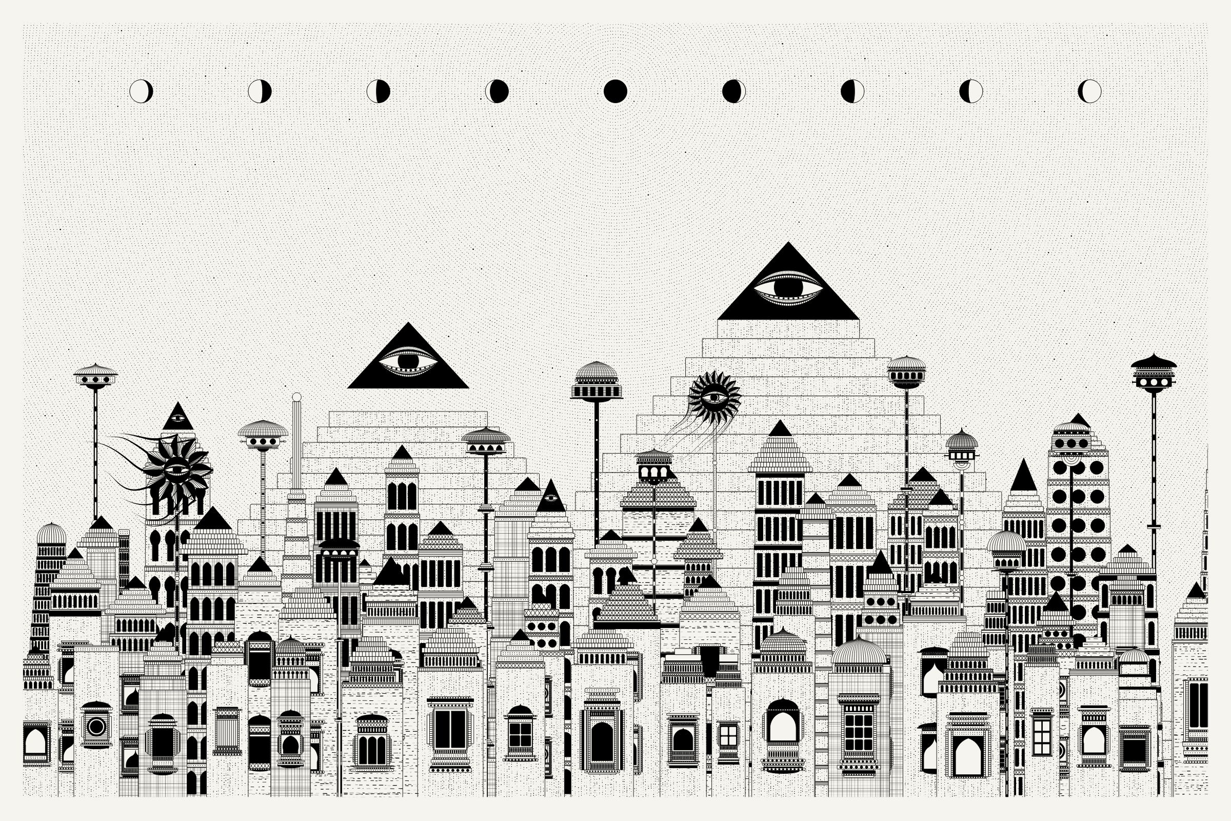 The algorithms and decision-making encoded into this generative art project intentionally imitate Fahad’s approach on traditional mediums - composition rules, textures, and overall themes. The visual elements are inspired by Fahad’s memories from his nomadic life. You’ll find intricate windows from Rajasthan, massive Egyptian pyramids rising from the horizon, a density of civilization only seen in New York, and the moon - a comforting and shared sight no matter where you stand.