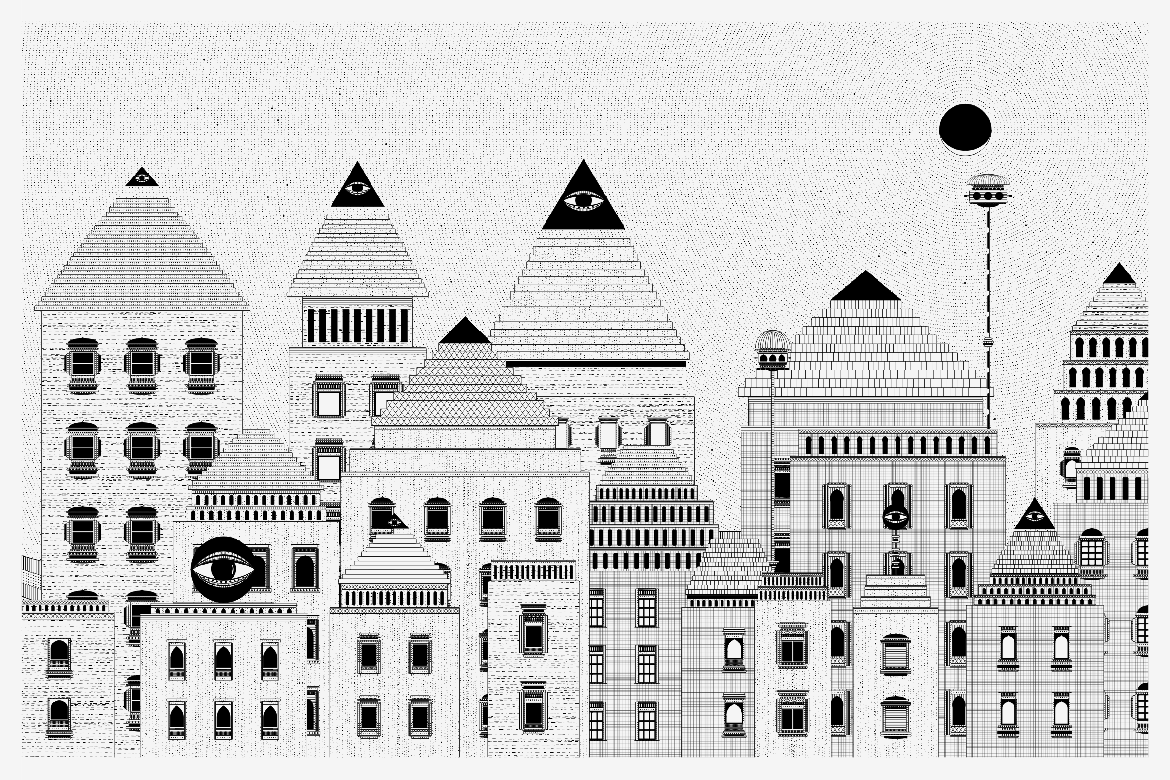 _Alan Ki Aankhen_ is an exploration of other-worldly cityscapes in the visual aesthetic of Fahad’s distinct style with pen and paper. The title, translated as _Alan’s Eyes_, alludes to Alan Turing’s machine intelligence test - a thought experiment foreshadowing a moment in which we can no longer differentiate between the real and the artificial. Though first proposed in 1950, the topic feels especially relevant today, as even our creative practices are being carried by shifting technological tides.