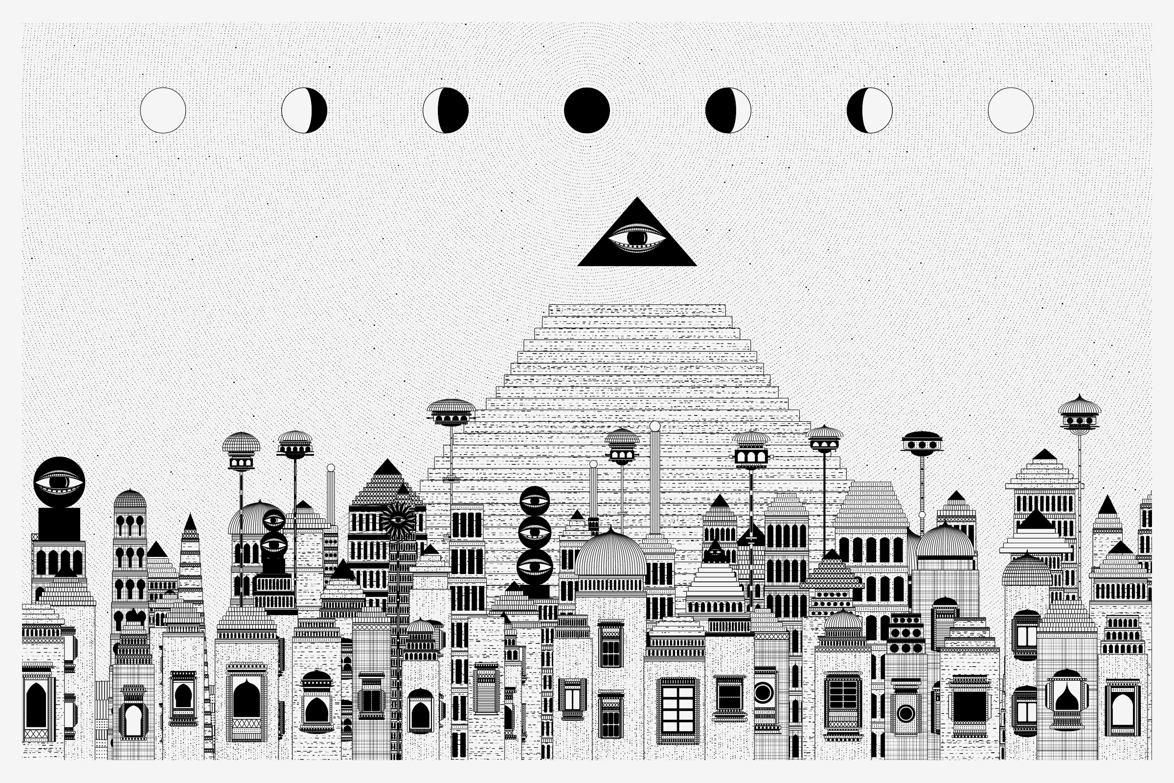The algorithms and decision-making encoded into this generative art project intentionally imitate Fahad’s approach on traditional mediums - composition rules, textures, and overall themes. The visual elements are inspired by Fahad’s memories from his nomadic life. You’ll find intricate windows from Rajasthan, massive Egyptian pyramids rising from the horizon, a density of civilization only seen in New York, and the moon - a comforting and shared sight no matter where you stand.