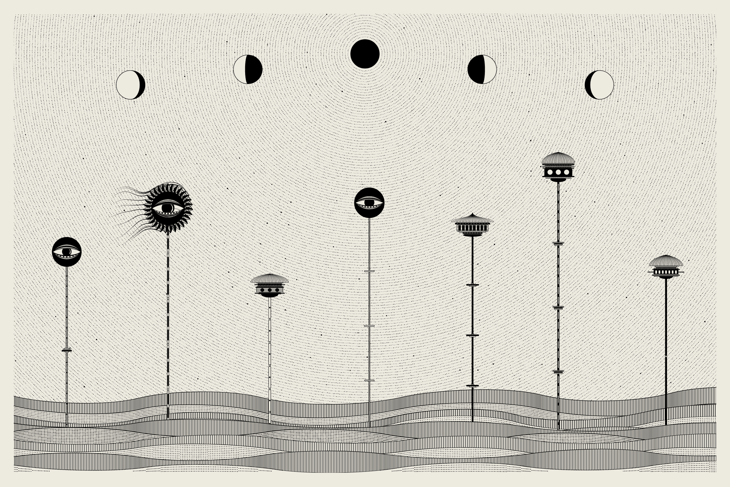 The algorithms and decision-making encoded into this generative art project intentionally imitate Fahad’s approach on traditional mediums - composition rules, textures, and overall themes. The visual elements are inspired by Fahad’s memories from his nomadic life. You’ll find intricate windows from Rajasthan, massive Egyptian pyramids rising from the horizon, a density of civilization only seen in New York, and the moon - a comforting and shared sight no matter where you stand.