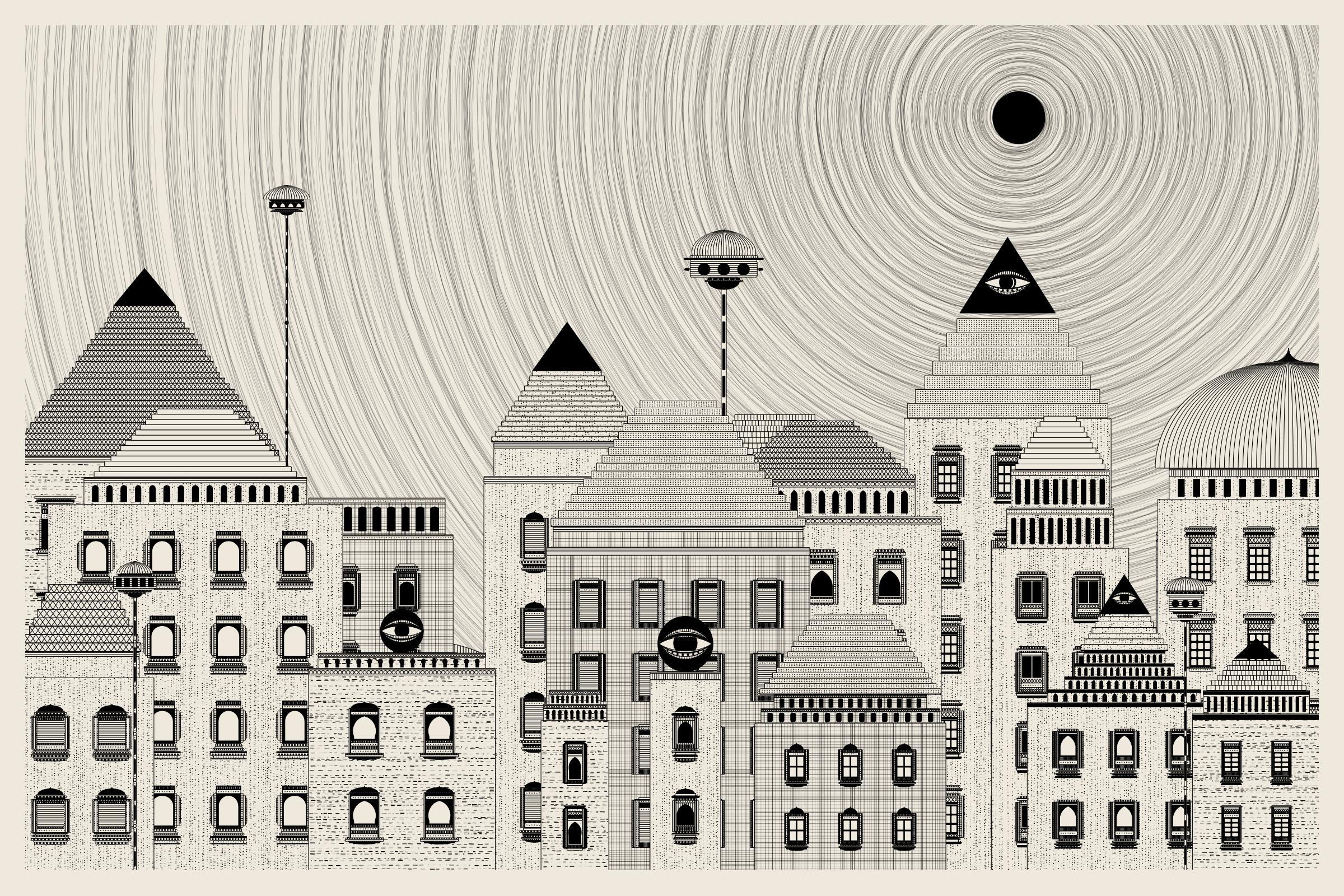 The algorithms and decision-making encoded into this generative art project intentionally imitate Fahad’s approach on traditional mediums - composition rules, textures, and overall themes. The visual elements are inspired by Fahad’s memories from his nomadic life. You’ll find intricate windows from Rajasthan, massive Egyptian pyramids rising from the horizon, a density of civilization only seen in New York, and the moon - a comforting and shared sight no matter where you stand.