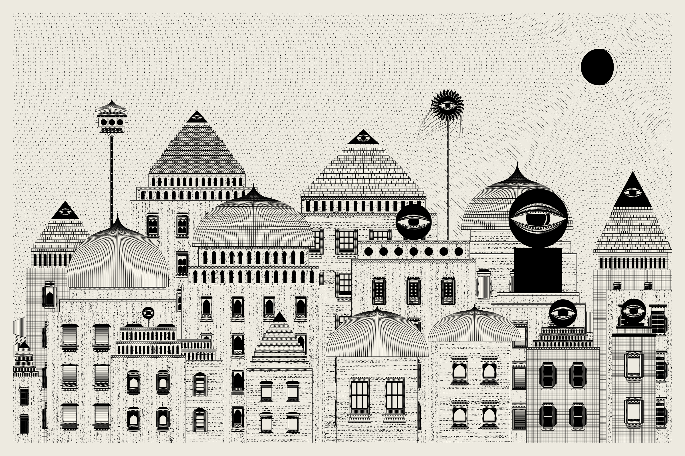 _Alan Ki Aankhen_ is an exploration of other-worldly cityscapes in the visual aesthetic of Fahad’s distinct style with pen and paper. The title, translated as _Alan’s Eyes_, alludes to Alan Turing’s machine intelligence test - a thought experiment foreshadowing a moment in which we can no longer differentiate between the real and the artificial. Though first proposed in 1950, the topic feels especially relevant today, as even our creative practices are being carried by shifting technological tides.