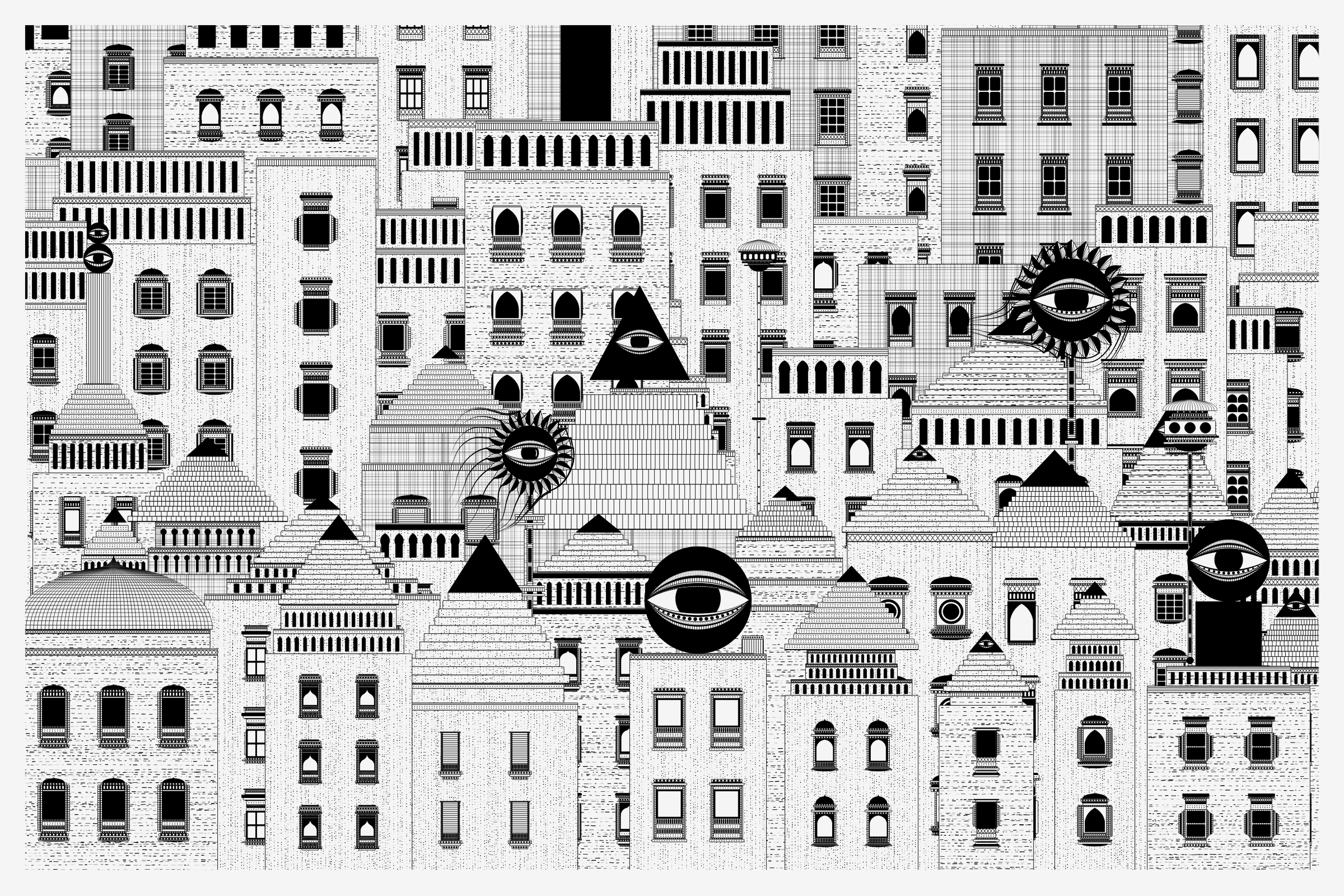 _Alan Ki Aankhen_ is an exploration of other-worldly cityscapes in the visual aesthetic of Fahad’s distinct style with pen and paper. The title, translated as _Alan’s Eyes_, alludes to Alan Turing’s machine intelligence test - a thought experiment foreshadowing a moment in which we can no longer differentiate between the real and the artificial. Though first proposed in 1950, the topic feels especially relevant today, as even our creative practices are being carried by shifting technological tides.