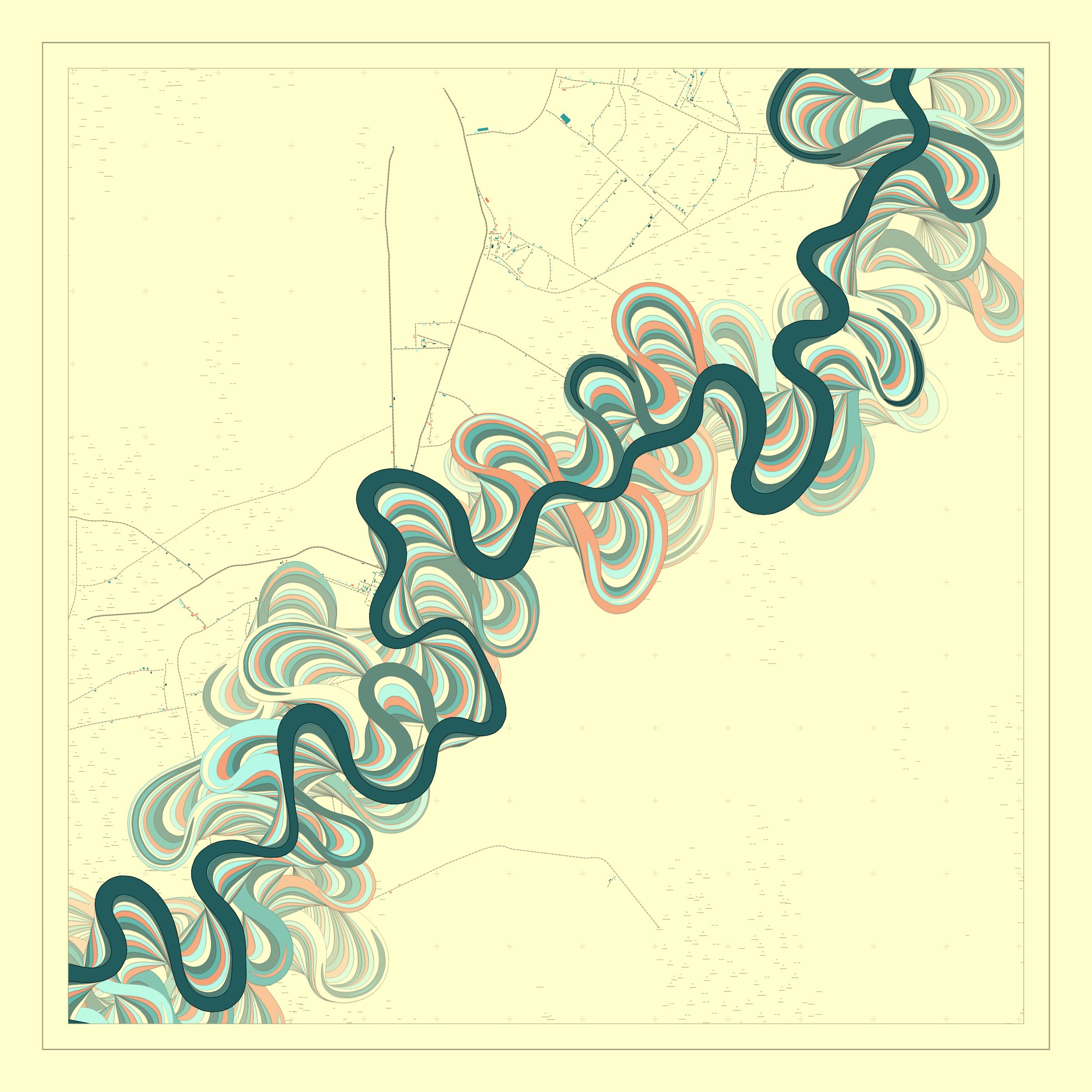 Ancient Courses is a generative experience that explores the aesthetics of meandering rivers and the settlements that form on their banks. The design is graphic and cartographic with bold color palettes rendered against map iconography and line sensibility. From the river banks, roads stretch across the landscape: sometimes a single access road, other times sprawling towns. The river meandering is simulated via a custom algorithm which closely models the real world process.