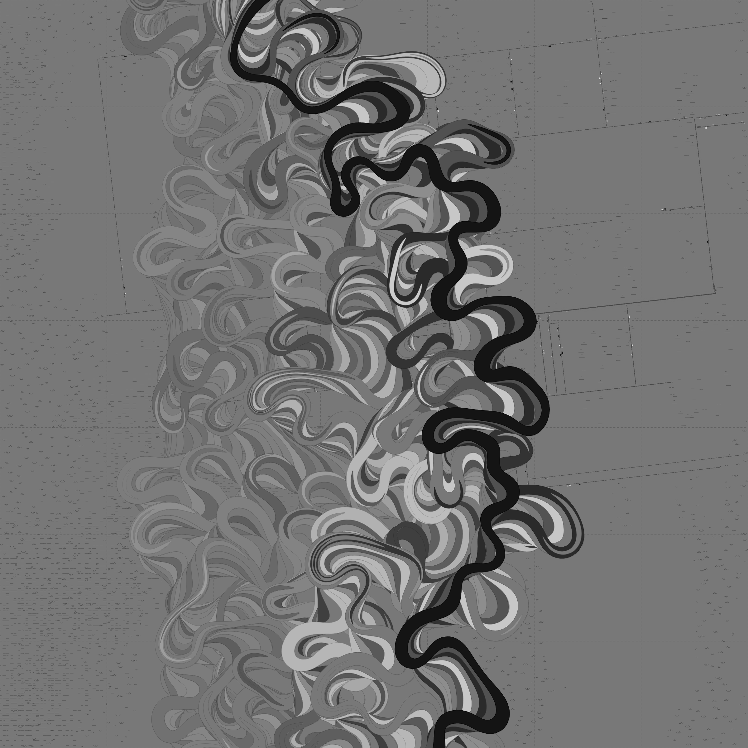 Ancient Courses is a generative experience that explores the aesthetics of meandering rivers and the settlements that form on their banks. The design is graphic and cartographic with bold color palettes rendered against map iconography and line sensibility. From the river banks, roads stretch across the landscape: sometimes a single access road, other times sprawling towns. The river meandering is simulated via a custom algorithm which closely models the real world process.