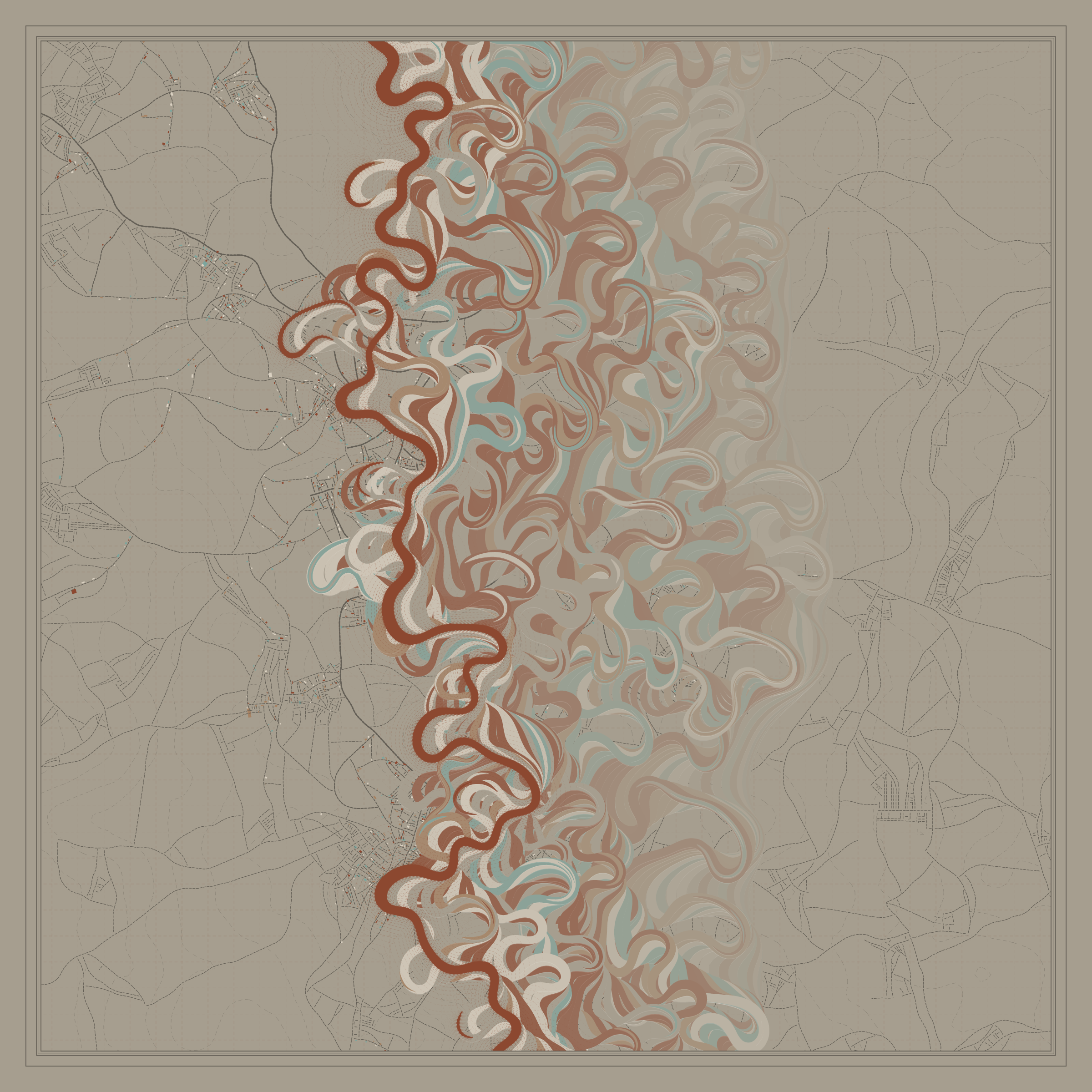 Ancient Courses is a generative experience that explores the aesthetics of meandering rivers and the settlements that form on their banks. The design is graphic and cartographic with bold color palettes rendered against map iconography and line sensibility. From the river banks, roads stretch across the landscape: sometimes a single access road, other times sprawling towns. The river meandering is simulated via a custom algorithm which closely models the real world process.