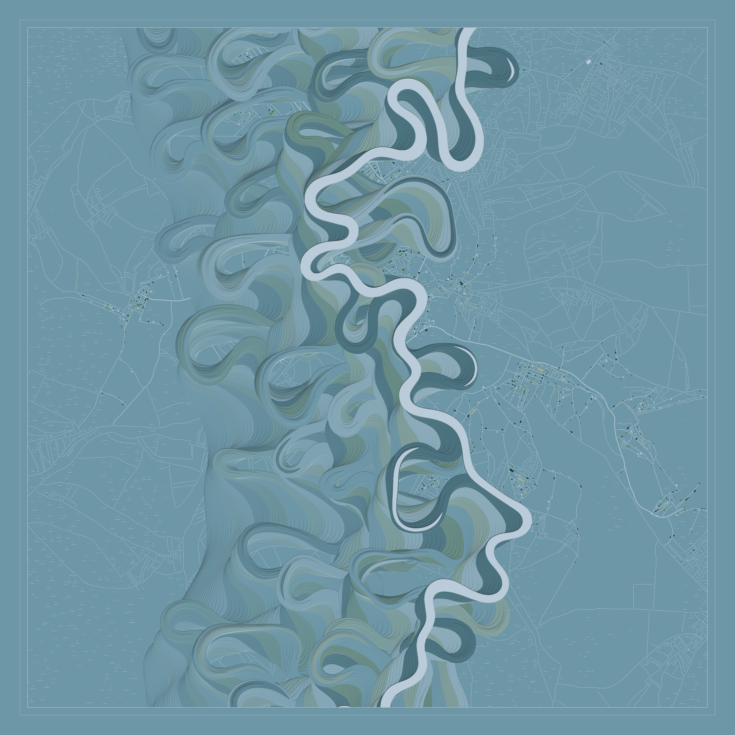 Ancient Courses is a generative experience that explores the aesthetics of meandering rivers and the settlements that form on their banks. The design is graphic and cartographic with bold color palettes rendered against map iconography and line sensibility. From the river banks, roads stretch across the landscape: sometimes a single access road, other times sprawling towns. The river meandering is simulated via a custom algorithm which closely models the real world process.