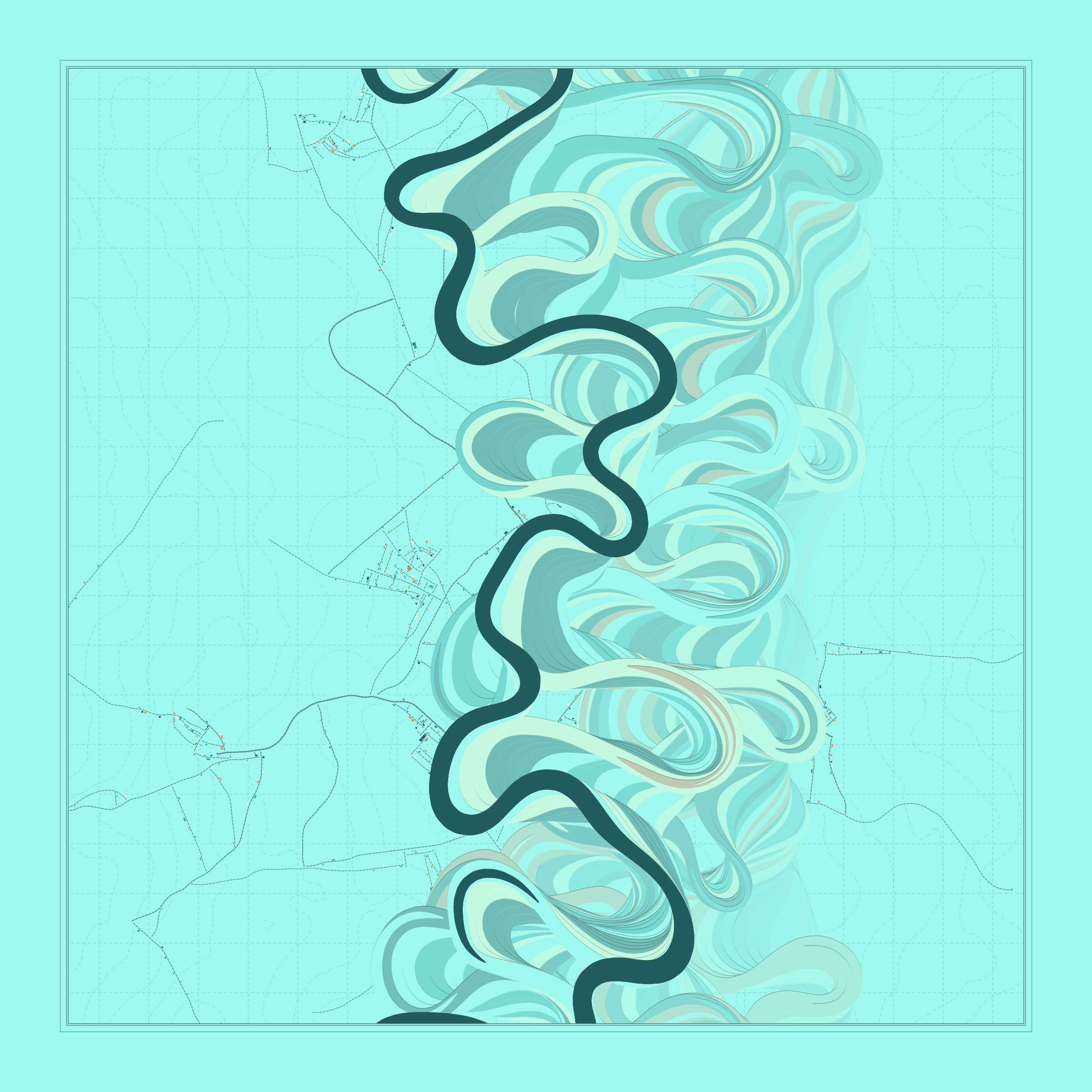 Ancient Courses is a generative experience that explores the aesthetics of meandering rivers and the settlements that form on their banks. The design is graphic and cartographic with bold color palettes rendered against map iconography and line sensibility. From the river banks, roads stretch across the landscape: sometimes a single access road, other times sprawling towns. The river meandering is simulated via a custom algorithm which closely models the real world process.