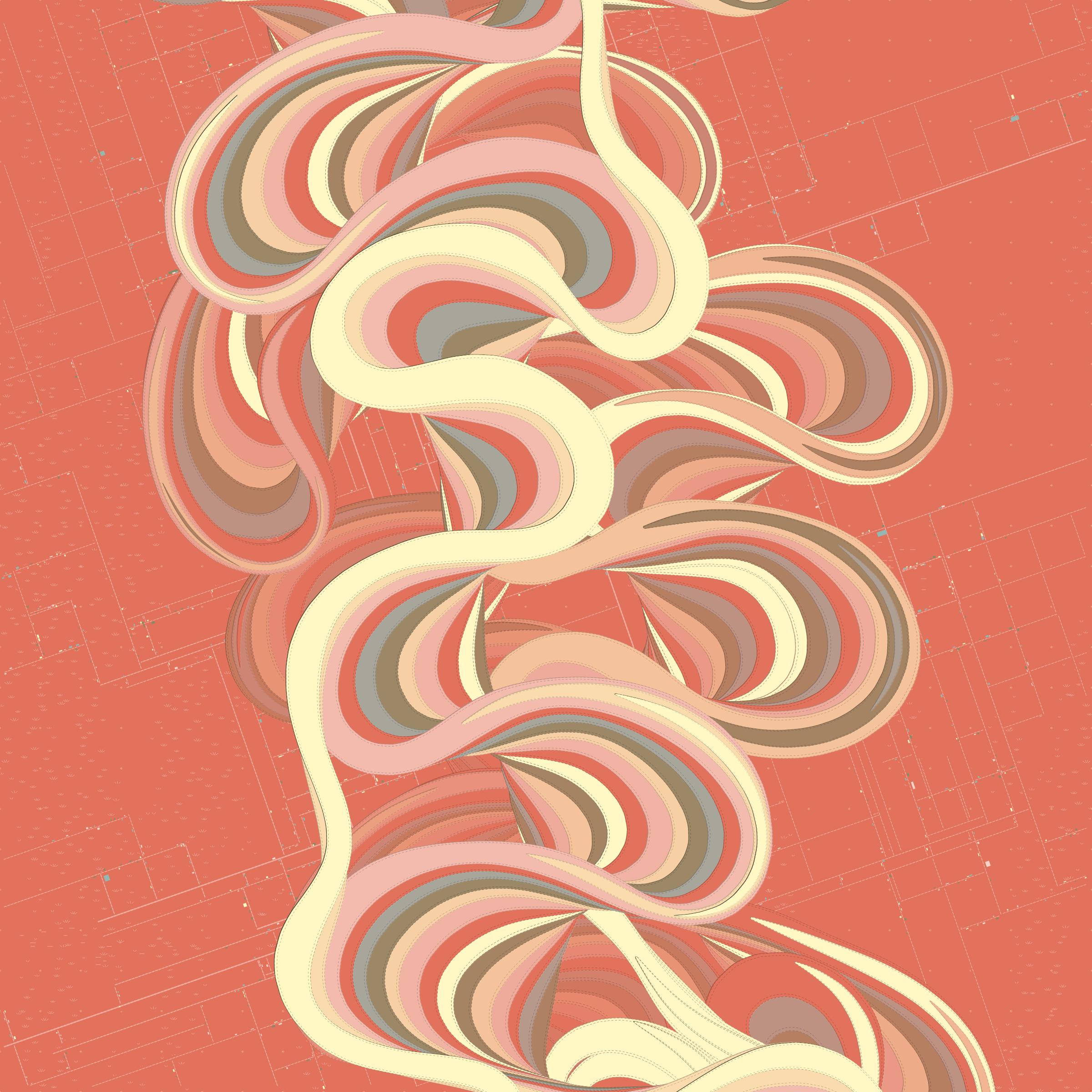 Ancient Courses is a generative experience that explores the aesthetics of meandering rivers and the settlements that form on their banks. The design is graphic and cartographic with bold color palettes rendered against map iconography and line sensibility. From the river banks, roads stretch across the landscape: sometimes a single access road, other times sprawling towns. The river meandering is simulated via a custom algorithm which closely models the real world process.