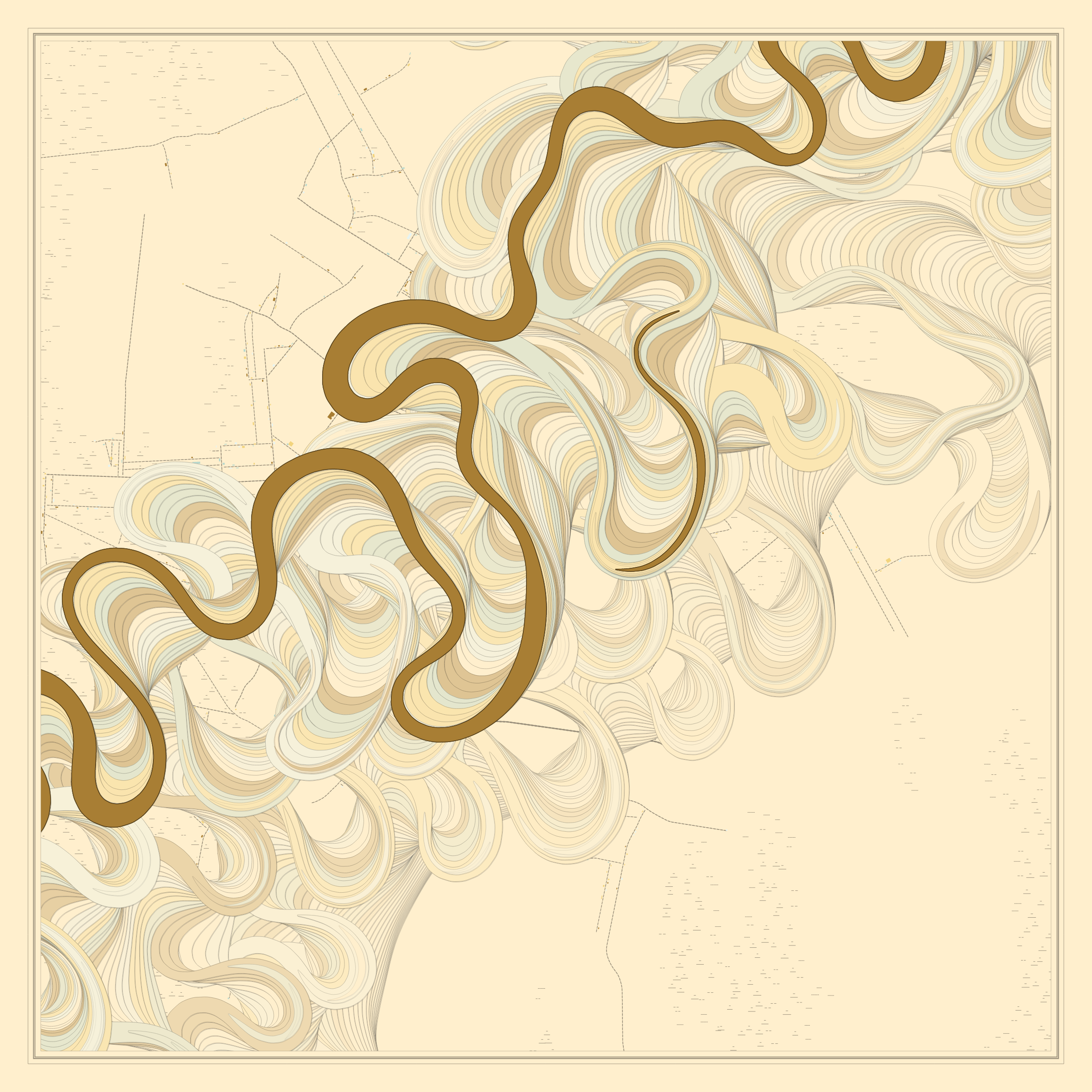 Ancient Courses is a generative experience that explores the aesthetics of meandering rivers and the settlements that form on their banks. The design is graphic and cartographic with bold color palettes rendered against map iconography and line sensibility. From the river banks, roads stretch across the landscape: sometimes a single access road, other times sprawling towns. The river meandering is simulated via a custom algorithm which closely models the real world process.