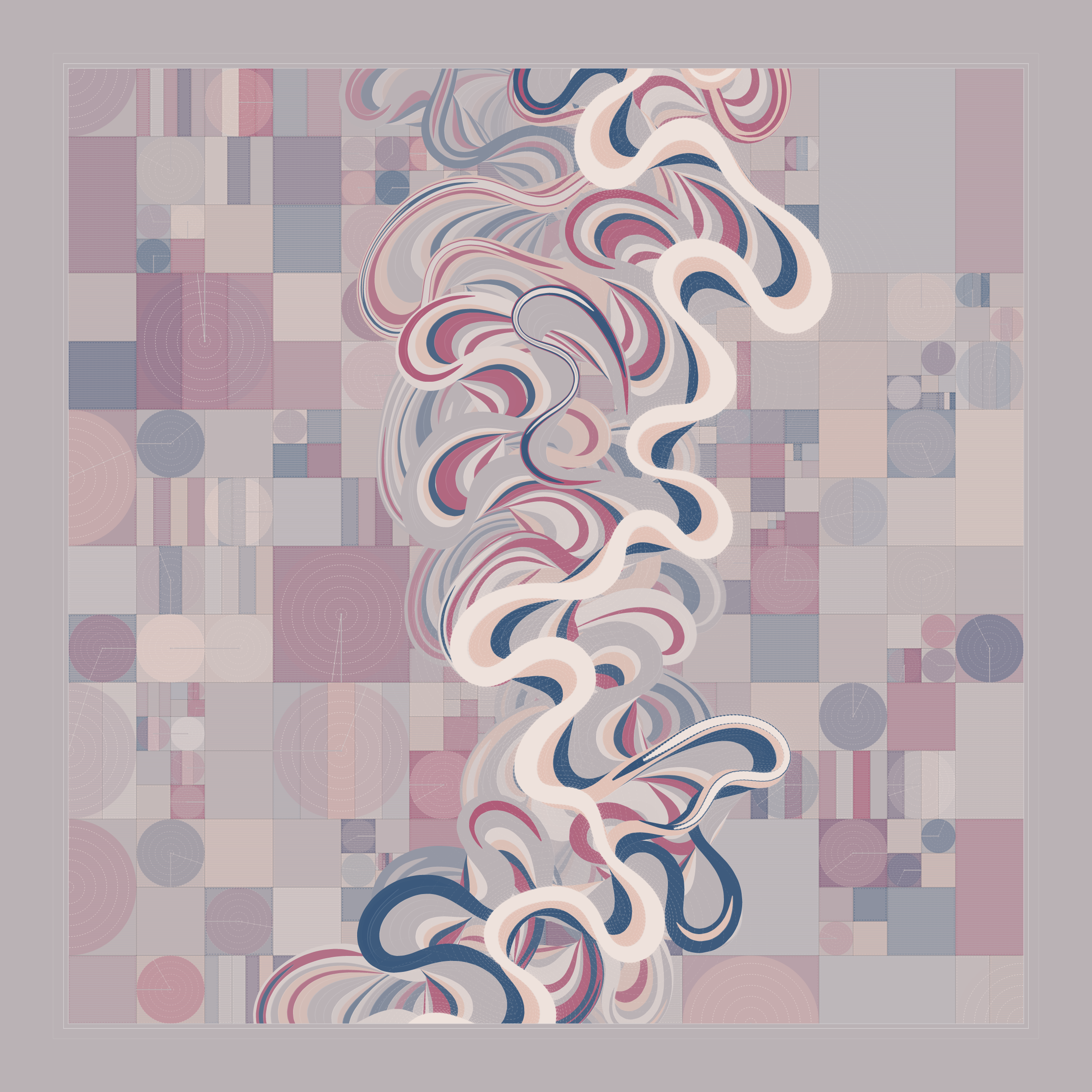 Ancient Courses is a generative experience that explores the aesthetics of meandering rivers and the settlements that form on their banks. The design is graphic and cartographic with bold color palettes rendered against map iconography and line sensibility. From the river banks, roads stretch across the landscape: sometimes a single access road, other times sprawling towns. The river meandering is simulated via a custom algorithm which closely models the real world process.