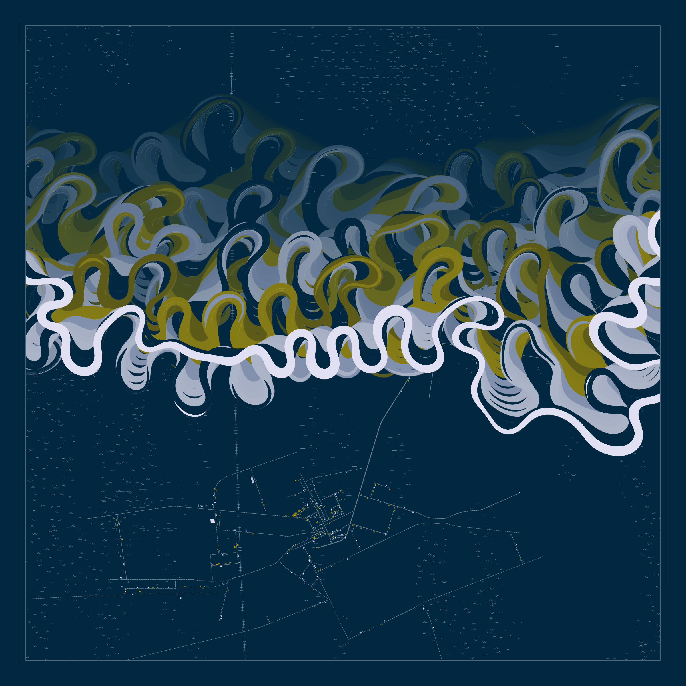 Ancient Courses is a generative experience that explores the aesthetics of meandering rivers and the settlements that form on their banks. The design is graphic and cartographic with bold color palettes rendered against map iconography and line sensibility. From the river banks, roads stretch across the landscape: sometimes a single access road, other times sprawling towns. The river meandering is simulated via a custom algorithm which closely models the real world process.