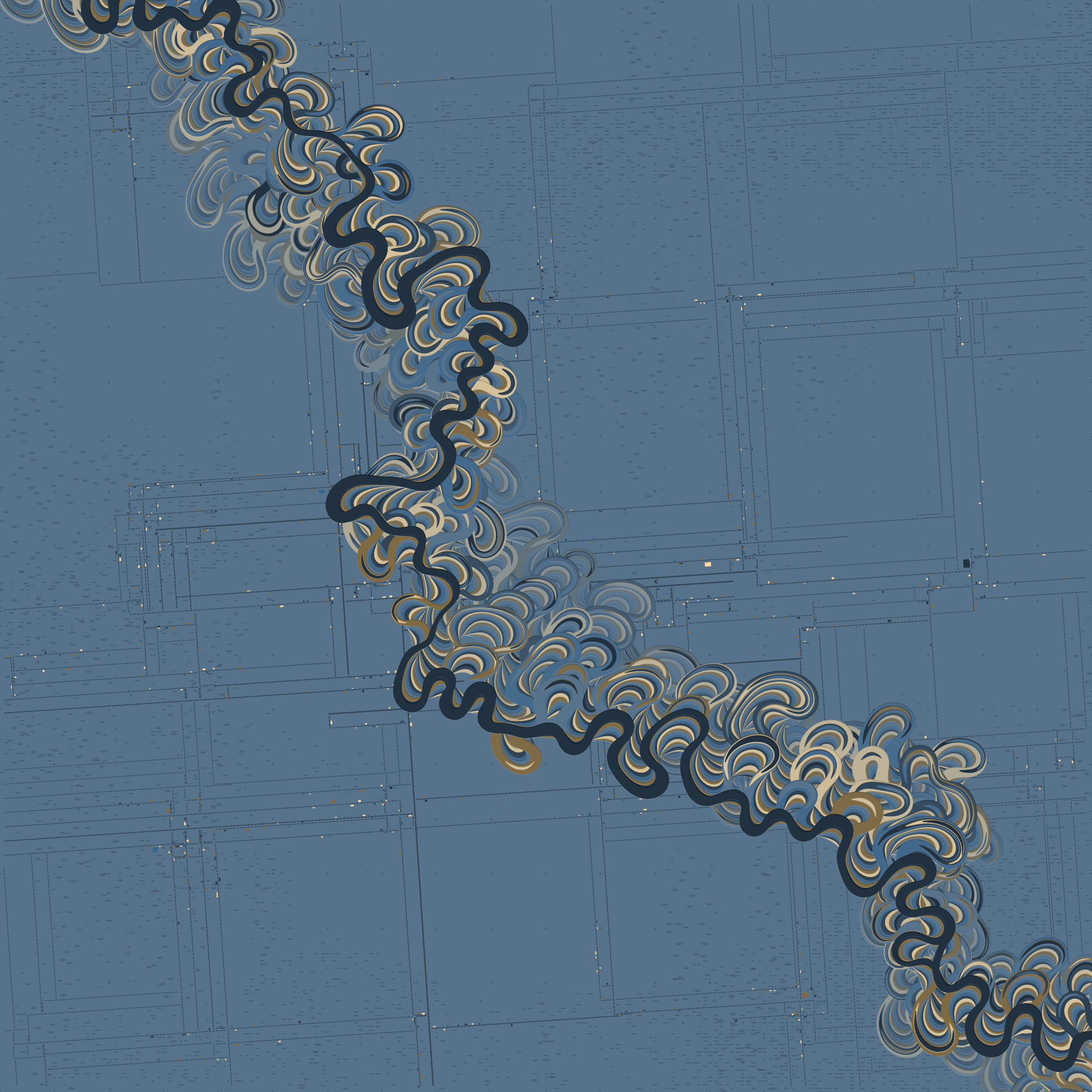 Ancient Courses is a generative experience that explores the aesthetics of meandering rivers and the settlements that form on their banks. The design is graphic and cartographic with bold color palettes rendered against map iconography and line sensibility. From the river banks, roads stretch across the landscape: sometimes a single access road, other times sprawling towns. The river meandering is simulated via a custom algorithm which closely models the real world process.