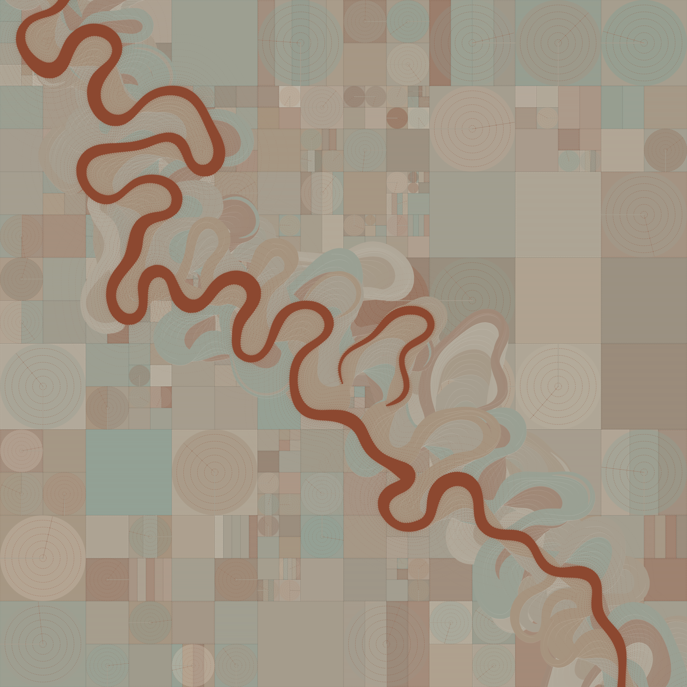 Ancient Courses is a generative experience that explores the aesthetics of meandering rivers and the settlements that form on their banks. The design is graphic and cartographic with bold color palettes rendered against map iconography and line sensibility. From the river banks, roads stretch across the landscape: sometimes a single access road, other times sprawling towns. The river meandering is simulated via a custom algorithm which closely models the real world process.