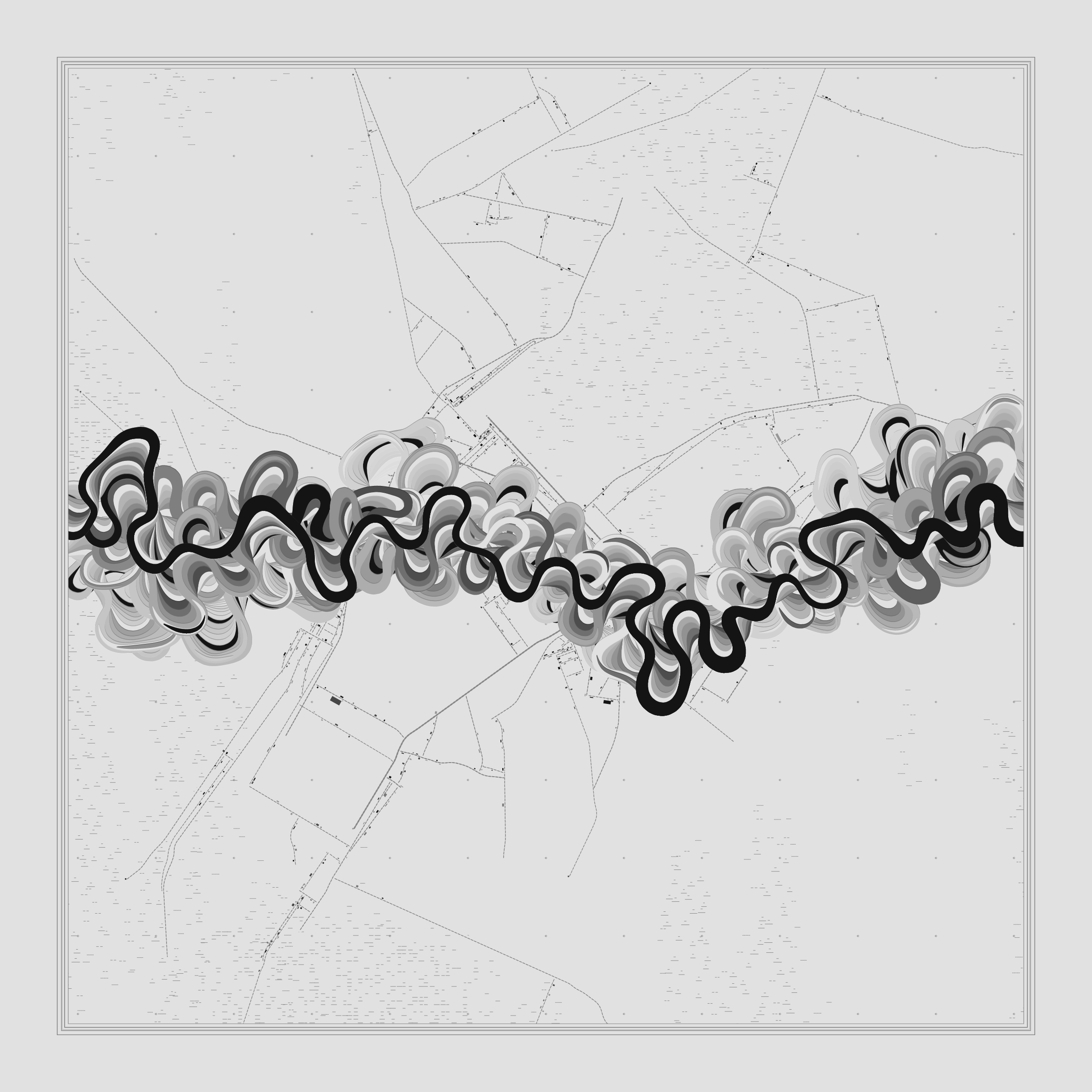 Ancient Courses is a generative experience that explores the aesthetics of meandering rivers and the settlements that form on their banks. The design is graphic and cartographic with bold color palettes rendered against map iconography and line sensibility. From the river banks, roads stretch across the landscape: sometimes a single access road, other times sprawling towns. The river meandering is simulated via a custom algorithm which closely models the real world process.