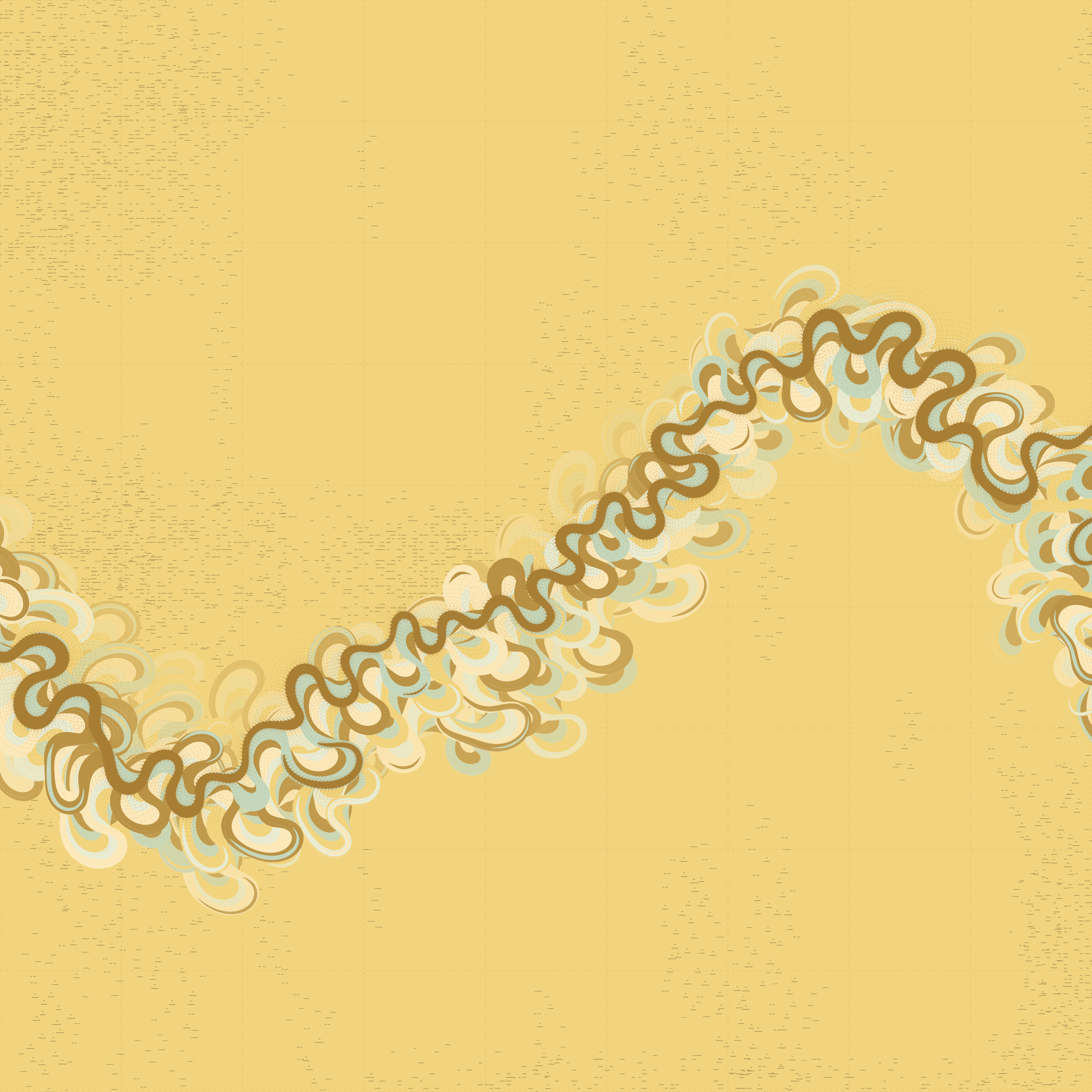 Ancient Courses is a generative experience that explores the aesthetics of meandering rivers and the settlements that form on their banks. The design is graphic and cartographic with bold color palettes rendered against map iconography and line sensibility. From the river banks, roads stretch across the landscape: sometimes a single access road, other times sprawling towns. The river meandering is simulated via a custom algorithm which closely models the real world process.