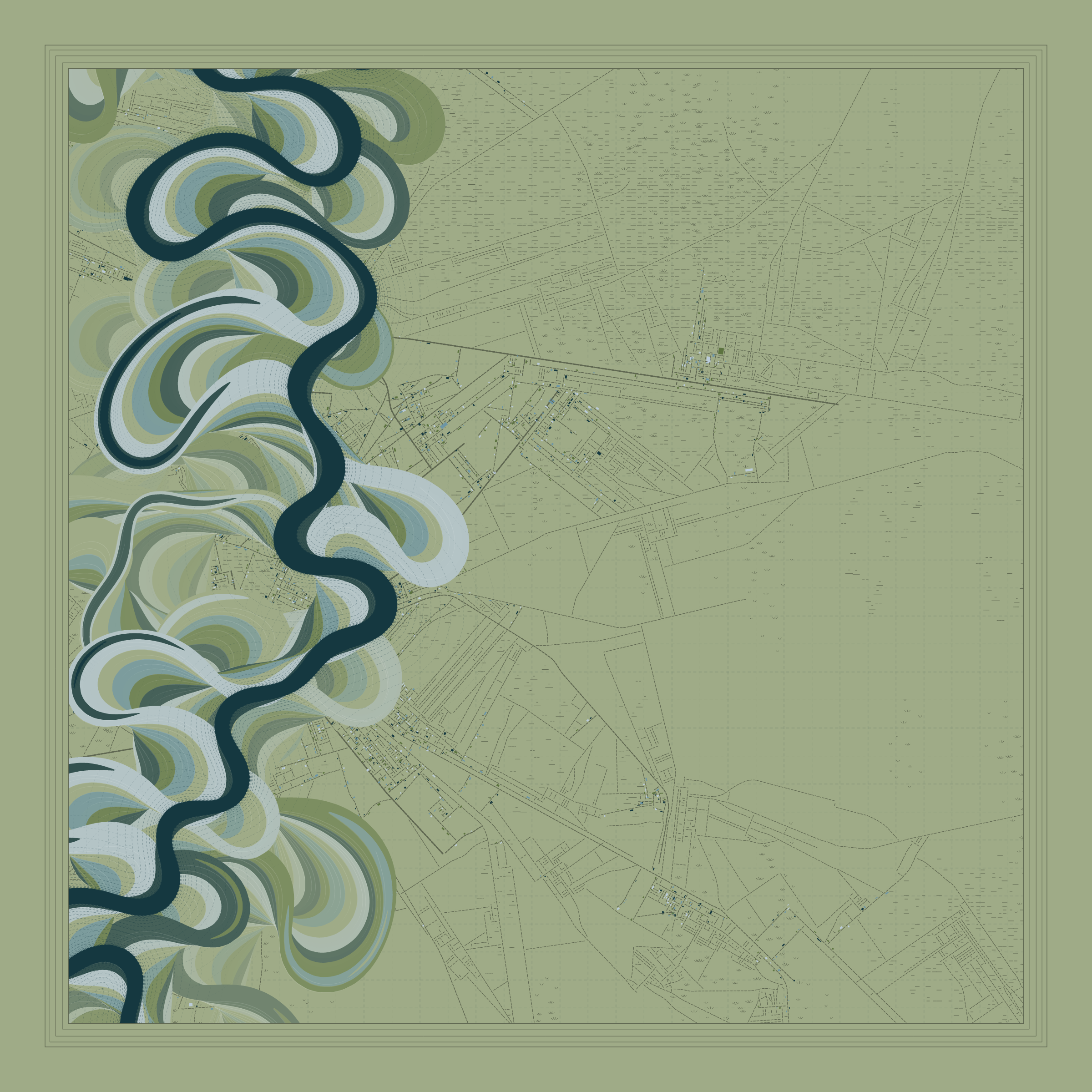 Ancient Courses is a generative experience that explores the aesthetics of meandering rivers and the settlements that form on their banks. The design is graphic and cartographic with bold color palettes rendered against map iconography and line sensibility. From the river banks, roads stretch across the landscape: sometimes a single access road, other times sprawling towns. The river meandering is simulated via a custom algorithm which closely models the real world process.