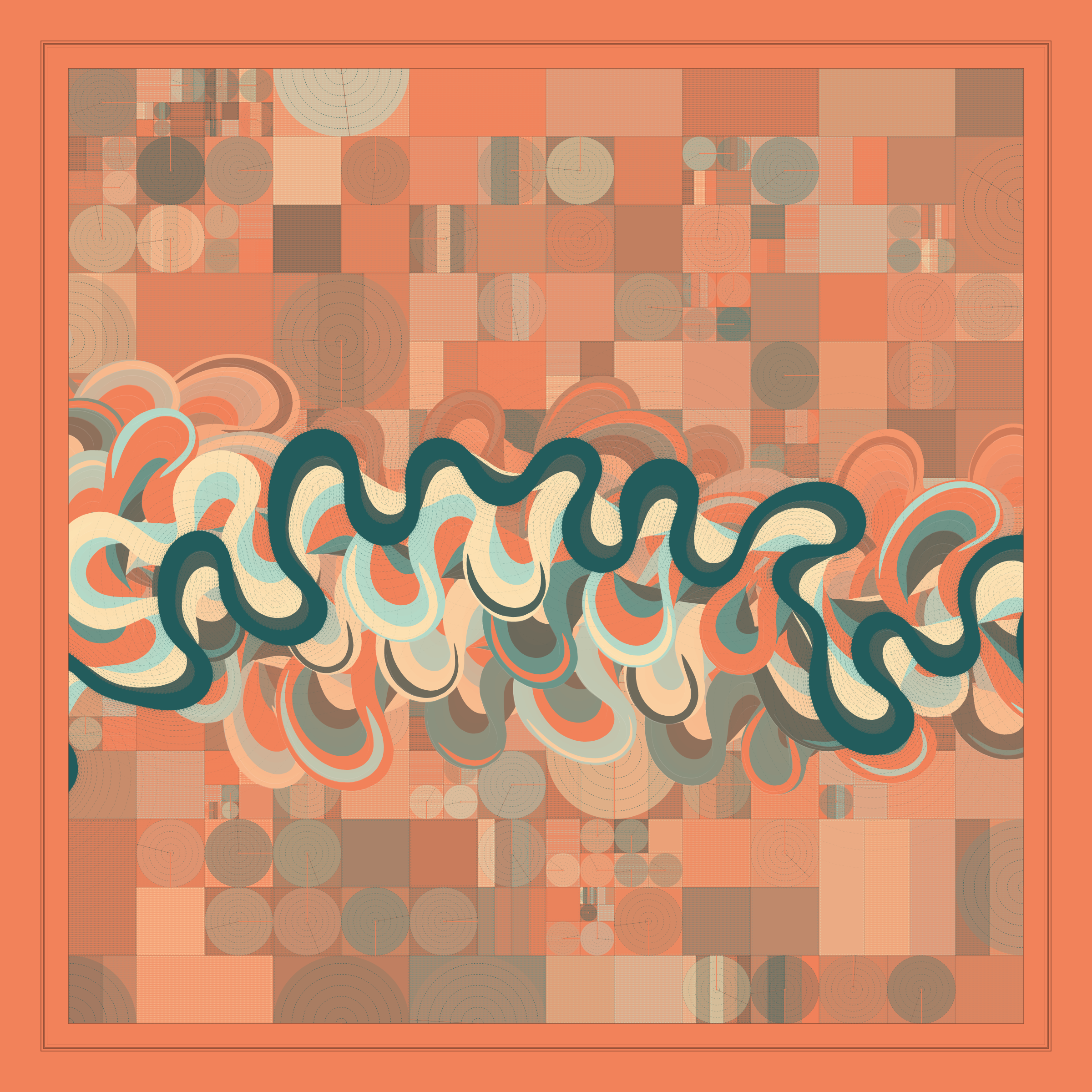 Ancient Courses is a generative experience that explores the aesthetics of meandering rivers and the settlements that form on their banks. The design is graphic and cartographic with bold color palettes rendered against map iconography and line sensibility. From the river banks, roads stretch across the landscape: sometimes a single access road, other times sprawling towns. The river meandering is simulated via a custom algorithm which closely models the real world process.