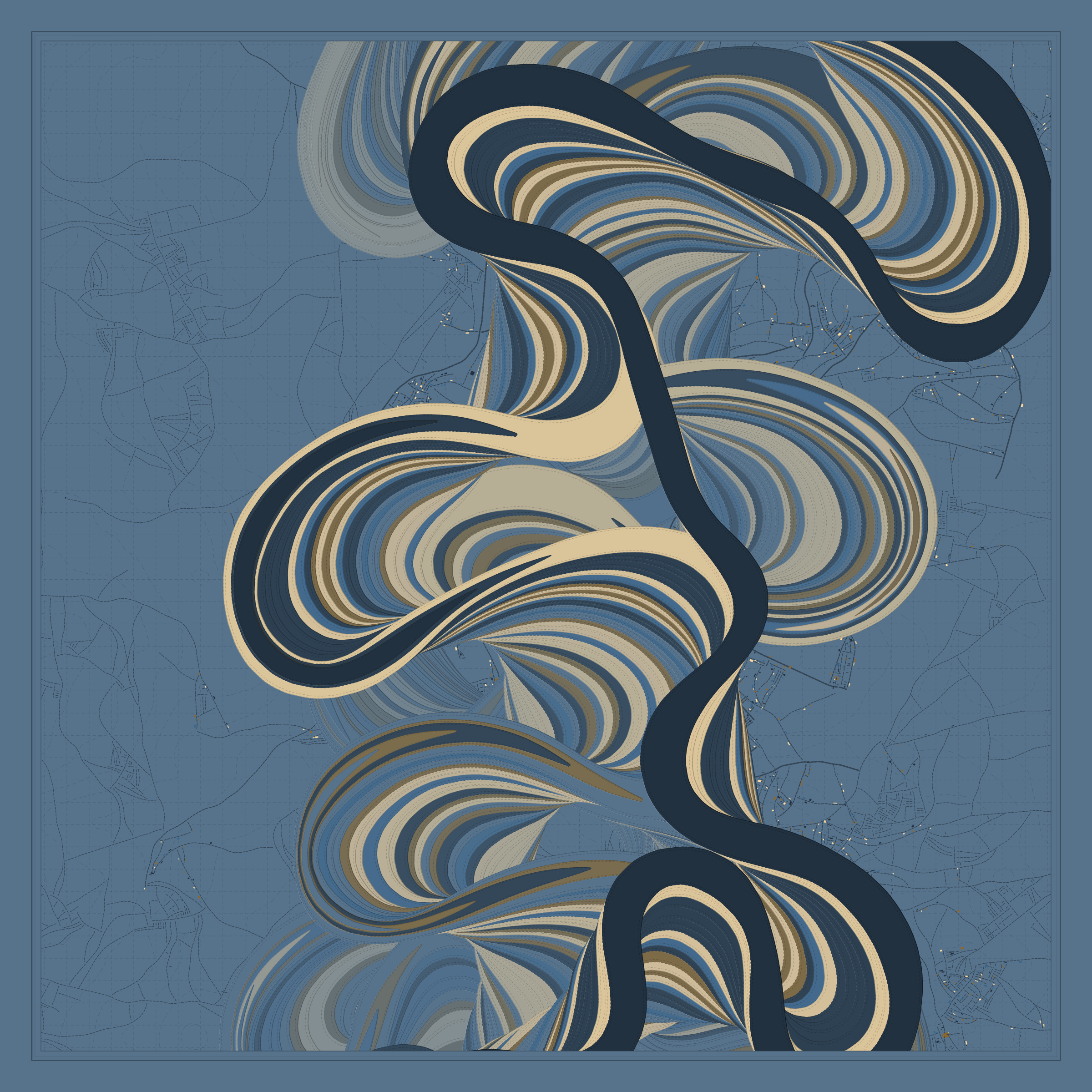 Ancient Courses is a generative experience that explores the aesthetics of meandering rivers and the settlements that form on their banks. The design is graphic and cartographic with bold color palettes rendered against map iconography and line sensibility. From the river banks, roads stretch across the landscape: sometimes a single access road, other times sprawling towns. The river meandering is simulated via a custom algorithm which closely models the real world process.