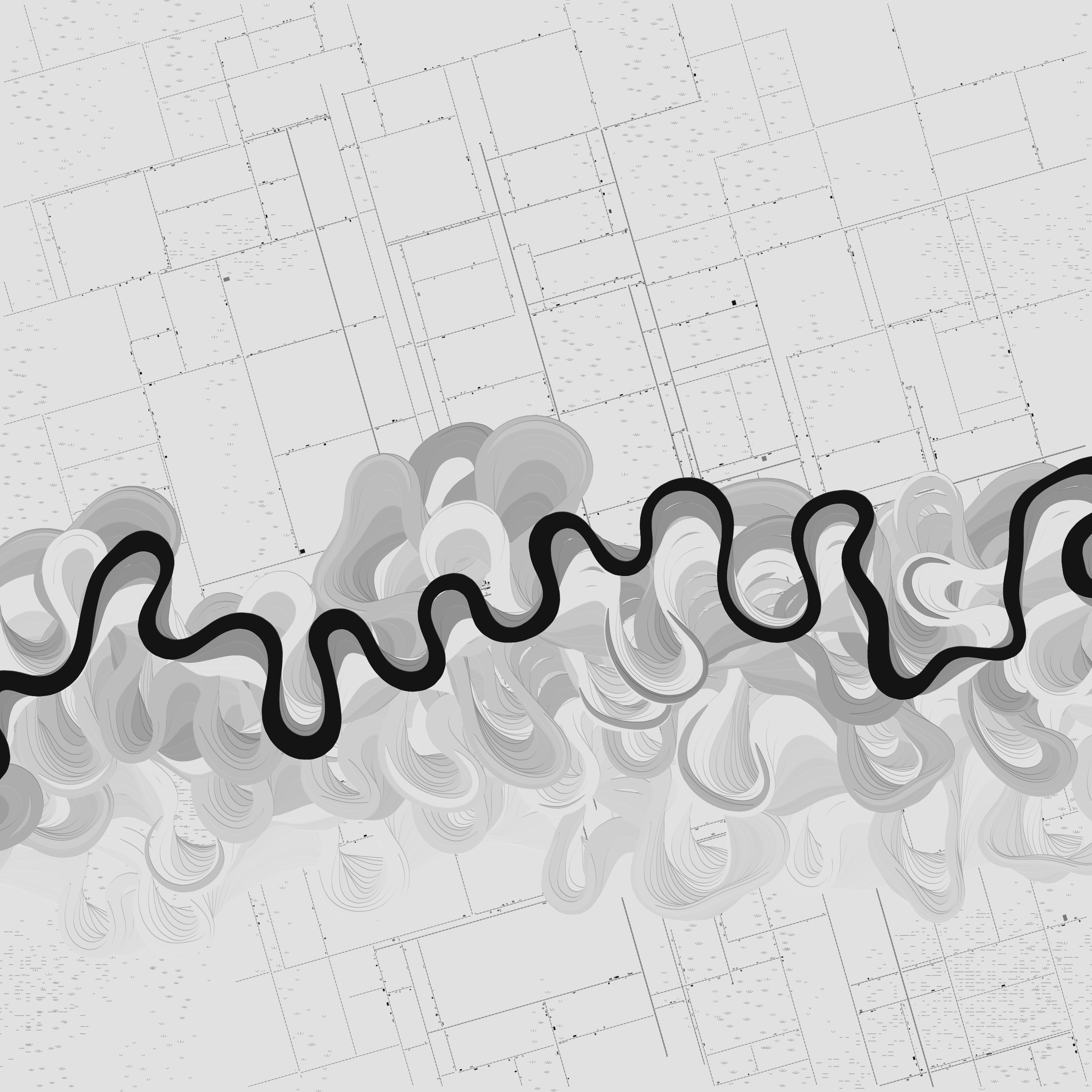 Ancient Courses is a generative experience that explores the aesthetics of meandering rivers and the settlements that form on their banks. The design is graphic and cartographic with bold color palettes rendered against map iconography and line sensibility. From the river banks, roads stretch across the landscape: sometimes a single access road, other times sprawling towns. The river meandering is simulated via a custom algorithm which closely models the real world process.