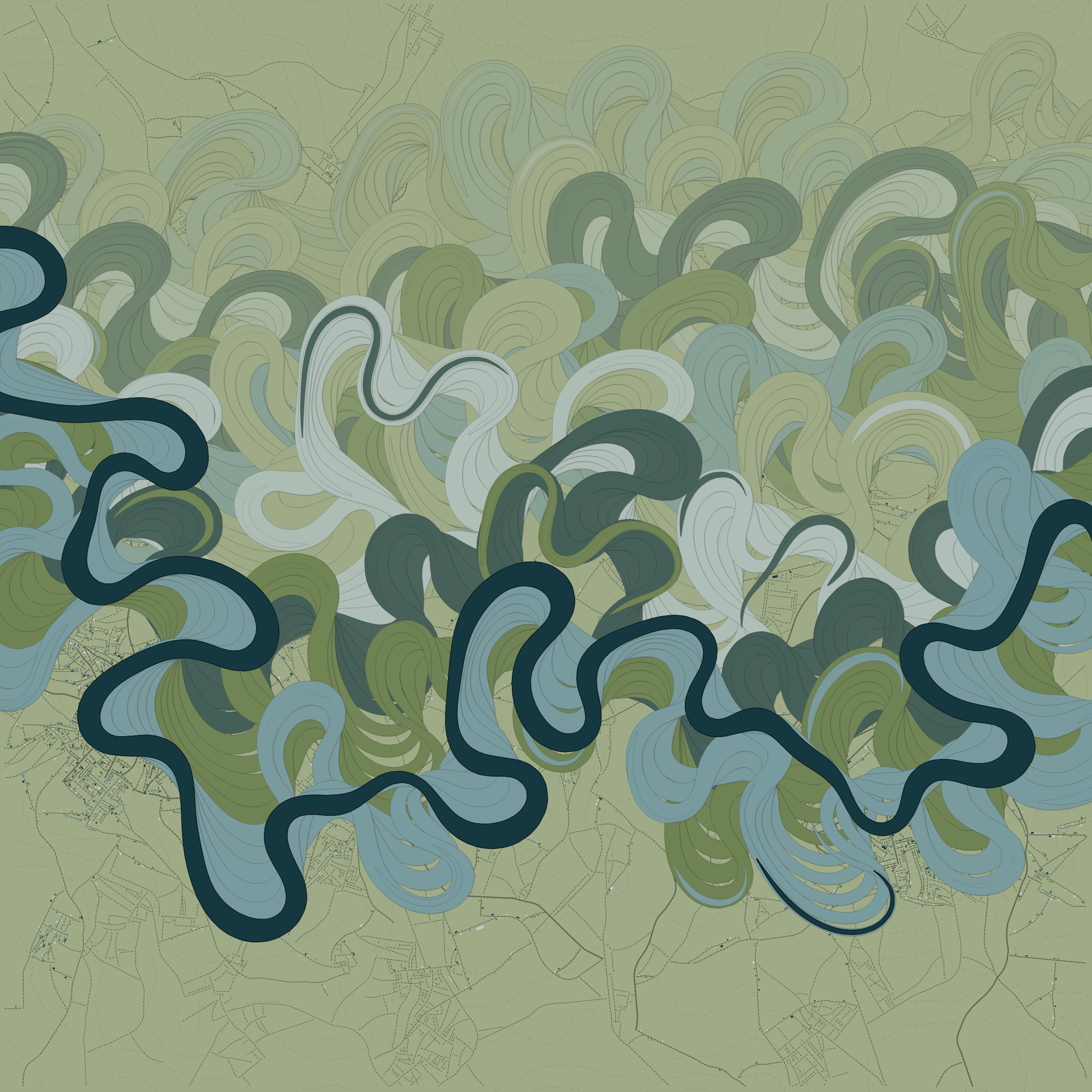 Ancient Courses is a generative experience that explores the aesthetics of meandering rivers and the settlements that form on their banks. The design is graphic and cartographic with bold color palettes rendered against map iconography and line sensibility. From the river banks, roads stretch across the landscape: sometimes a single access road, other times sprawling towns. The river meandering is simulated via a custom algorithm which closely models the real world process.